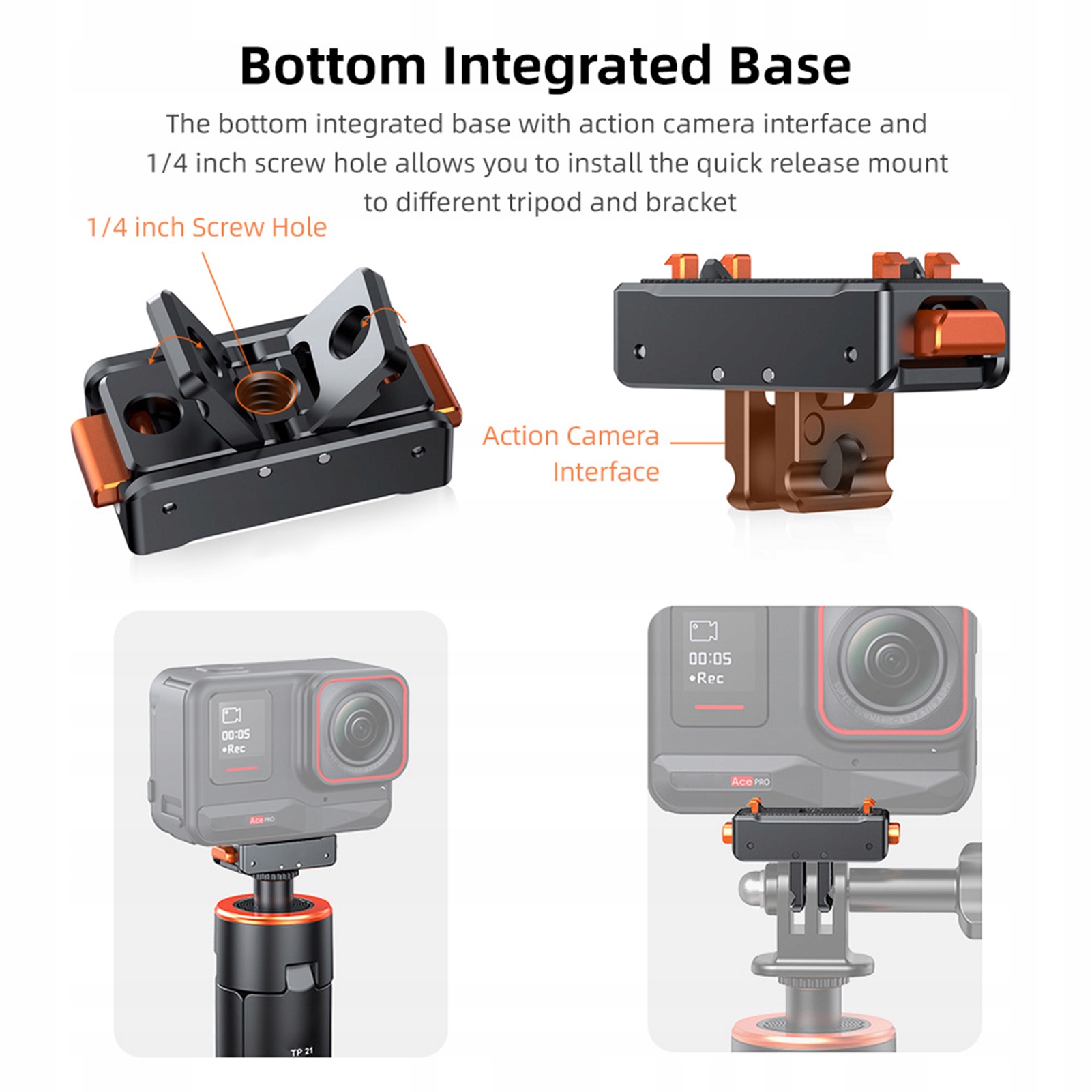 4. 【Интегрированная нижняя база】 Нижняя интегрированная база с интерфейсом камеры действия и 1/4 дюйма от отверстия винта позволяет установить быстрое крепление с выпуском к другому штативу и кронштейну.