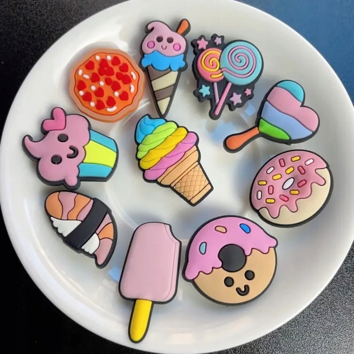 Добавьте цвет и веселье в ваши крокодилы! 🎉 Этот набор 10 булавок в форме еды и сладостей - идеальное украшение для детей и взрослых, которые любят оригинальные аксессуары. Все булавки изготовлены из прочного, гибкого материала из ПВХ - легко установить и снимать.