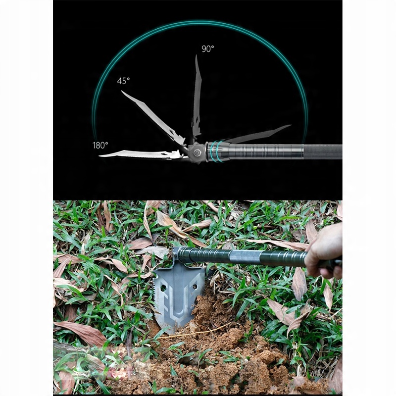 Изделие изготовлено из нержавеющей стали и алюминиевого сплава высочайшего качества, что делает его очень прочным и не повредится после первого похода. Конструкция спроектирована таким образом, что она надежно лежит в руках, независимо от того, какую функцию мы хотим использовать. Головку лопаты можно складывать под разными углами для разных задач