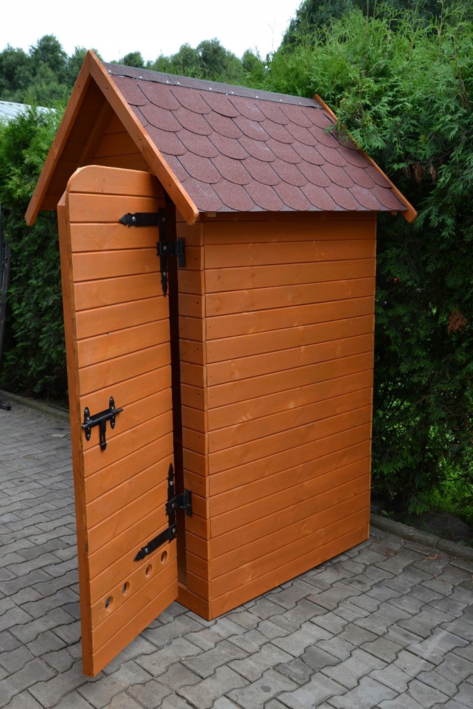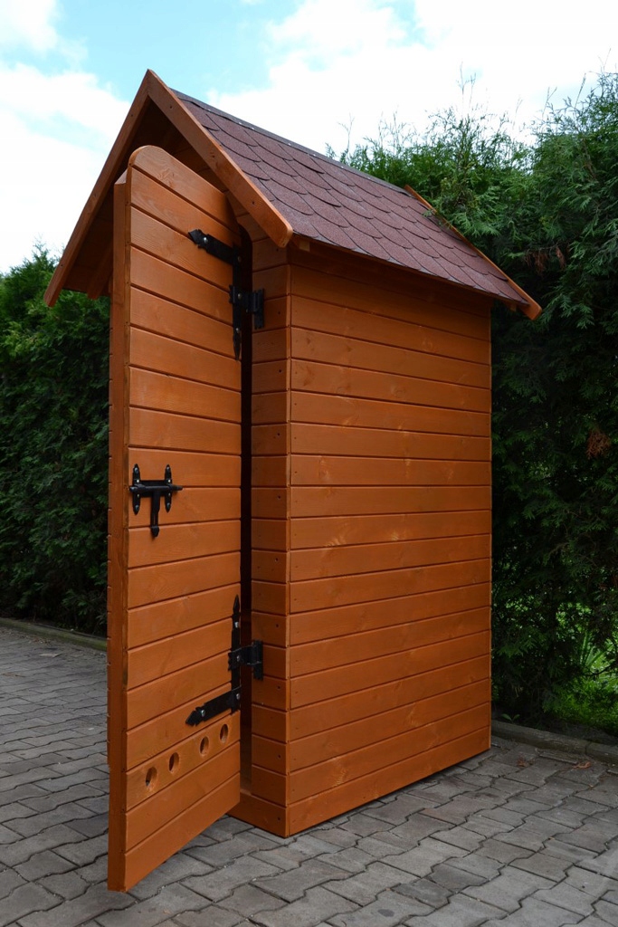 Унитаз изготовлен из сушеной древесины сосны, дерево окрашено водостойкими пропитками. Конструкция туалета на балках 4х4 и обшивке 17 мм, крыша покрыта черепицей.