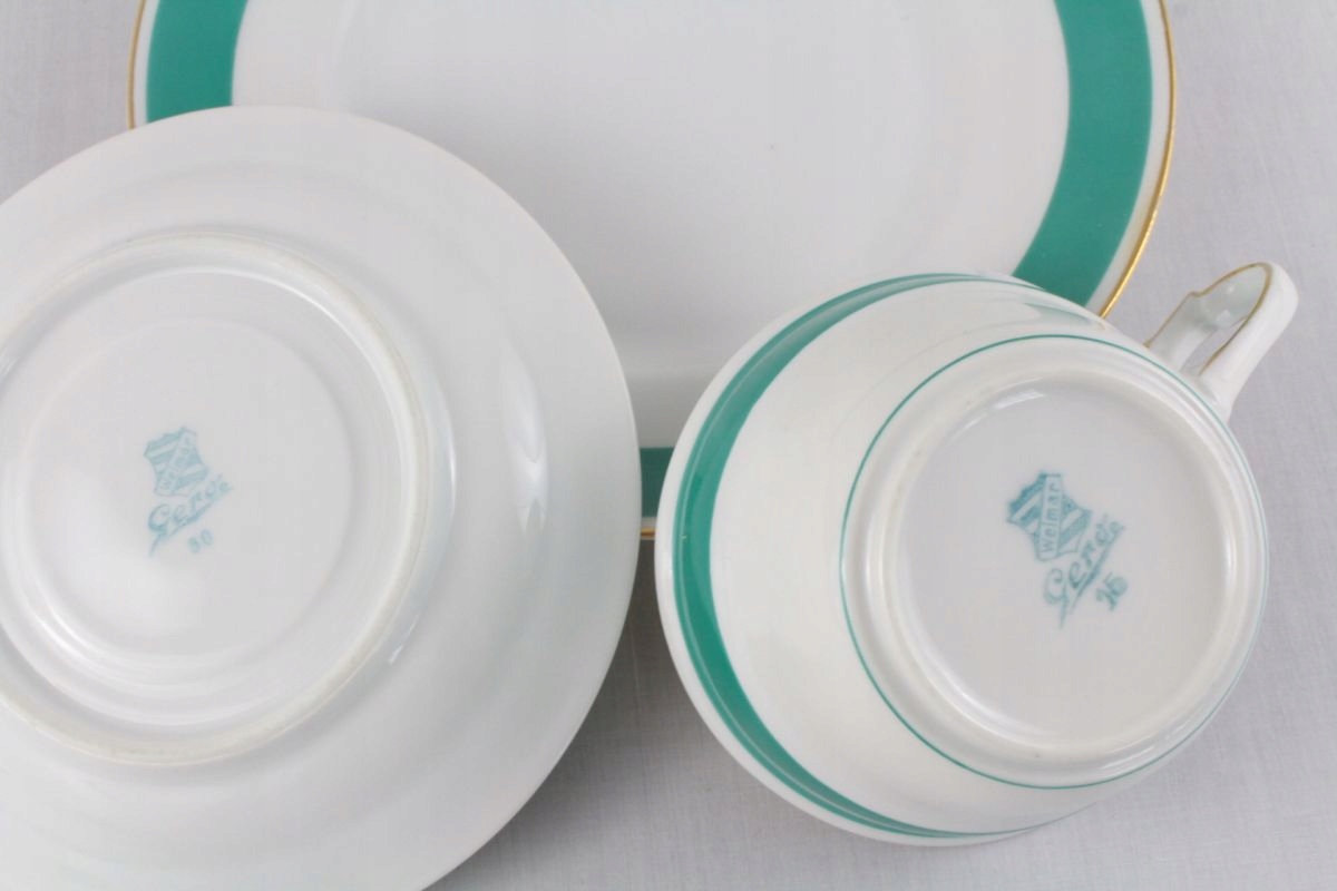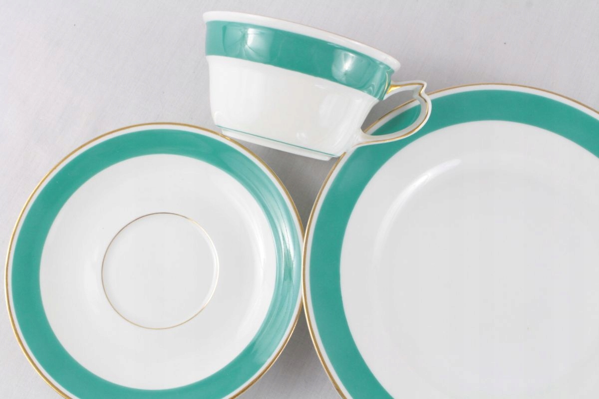 Белый, нежный фарфор. Красивые пастельно-зеленые ободки с позолотой.