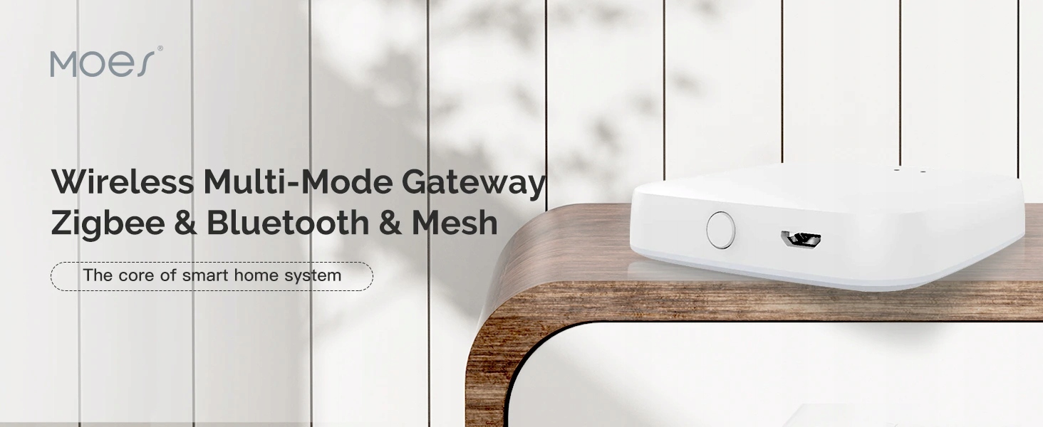 Беспроводной центральный блок Moes Smart Gateway. Интеллектуальные мультимодные затворы совместим с Zigbee, Bluetooth BLE и Mesh и обеспечивает связь между всеми совместимыми устройствами. В то же время он может сочетать до 128 различных датчиков или переключателей с различными протоколами, включая датчики движения, температуру, влажность, дым или открытую дверь. Настройки могут быть сделаны с использованием мобильного приложения MOES, TUYA или SmartLife