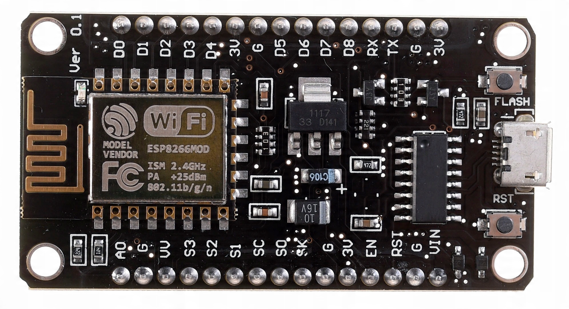 Для удобства пользователей плата включает микросхемы USB-Serial CH340G, обеспечивающие бесперебойную связь с компьютером (порт Micro USB) и регулятор напряжения, если плата питается от других источников.