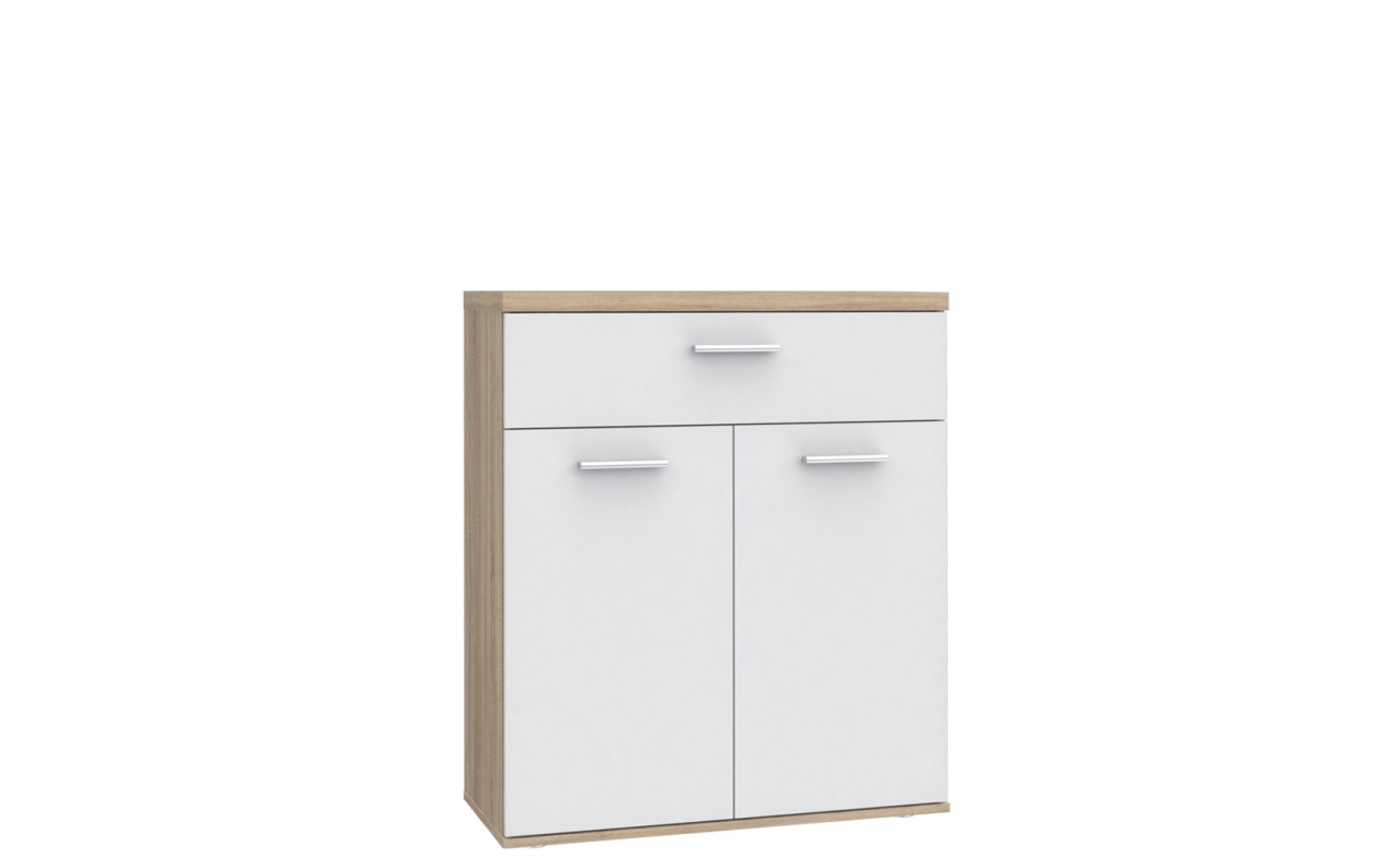Высокий комод, сделанный в стиле, который подходит для подростков. Мебель доступна в комбинации двух окрасок: дубового кузова Sonoma, белых фронтов Uni. Яркий сундук с ящиками с шкафами и ящиком, безусловно, диверсифицирует внутреннюю часть комнаты