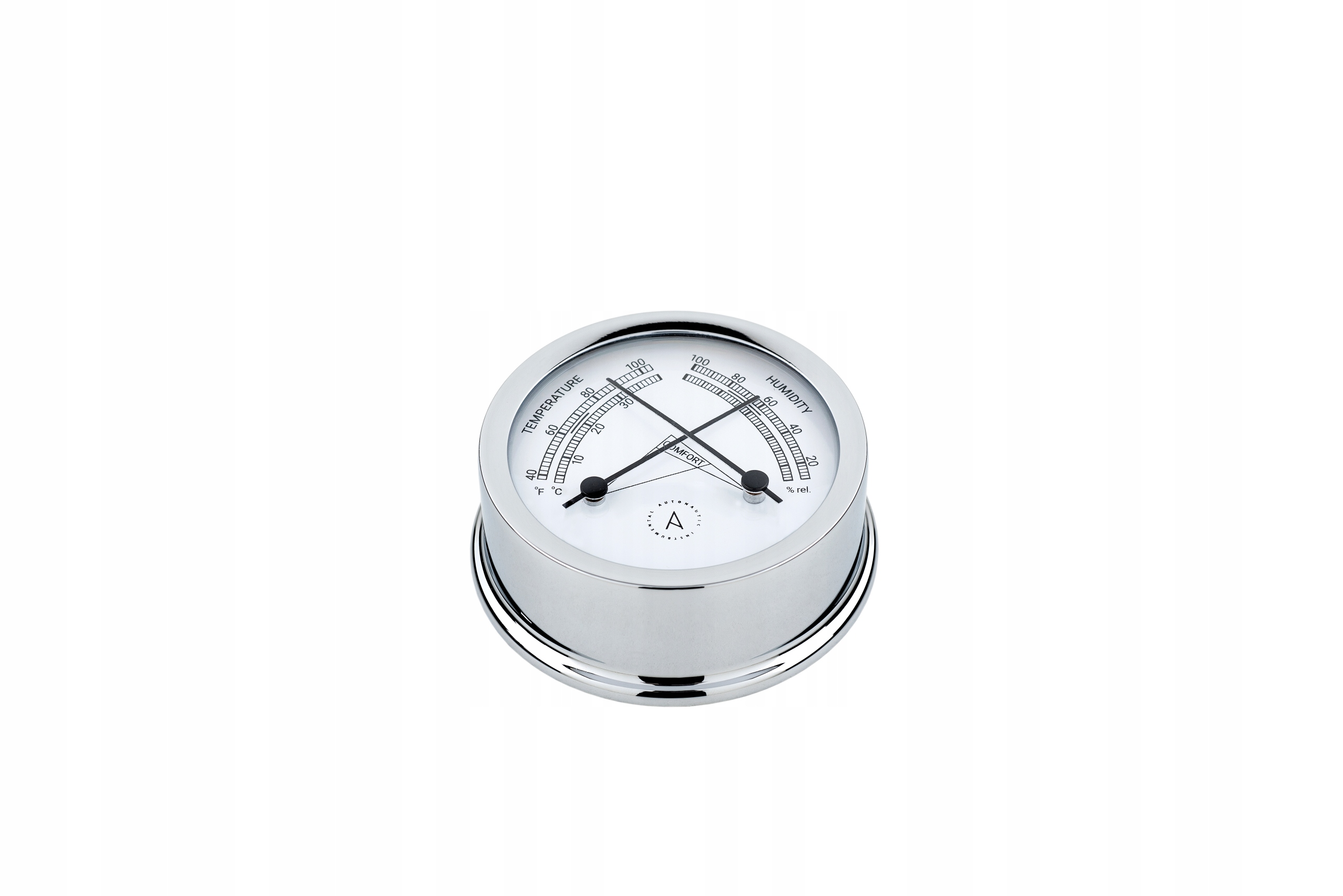Морской термогигрометр с комбинацией термометра и гигрометра. Он имеет ложу с блестящей хромированной отделкой и черными цифрами на белом циферблате с монтажным кольцом. Разместить комформер можно быстро и без проблем, поэтому вы можете наслаждаться его красотой где угодно. Оснащен точным механизмом. Корпус устойчив к любым погодным условиям, царапинам и выцветанию.
