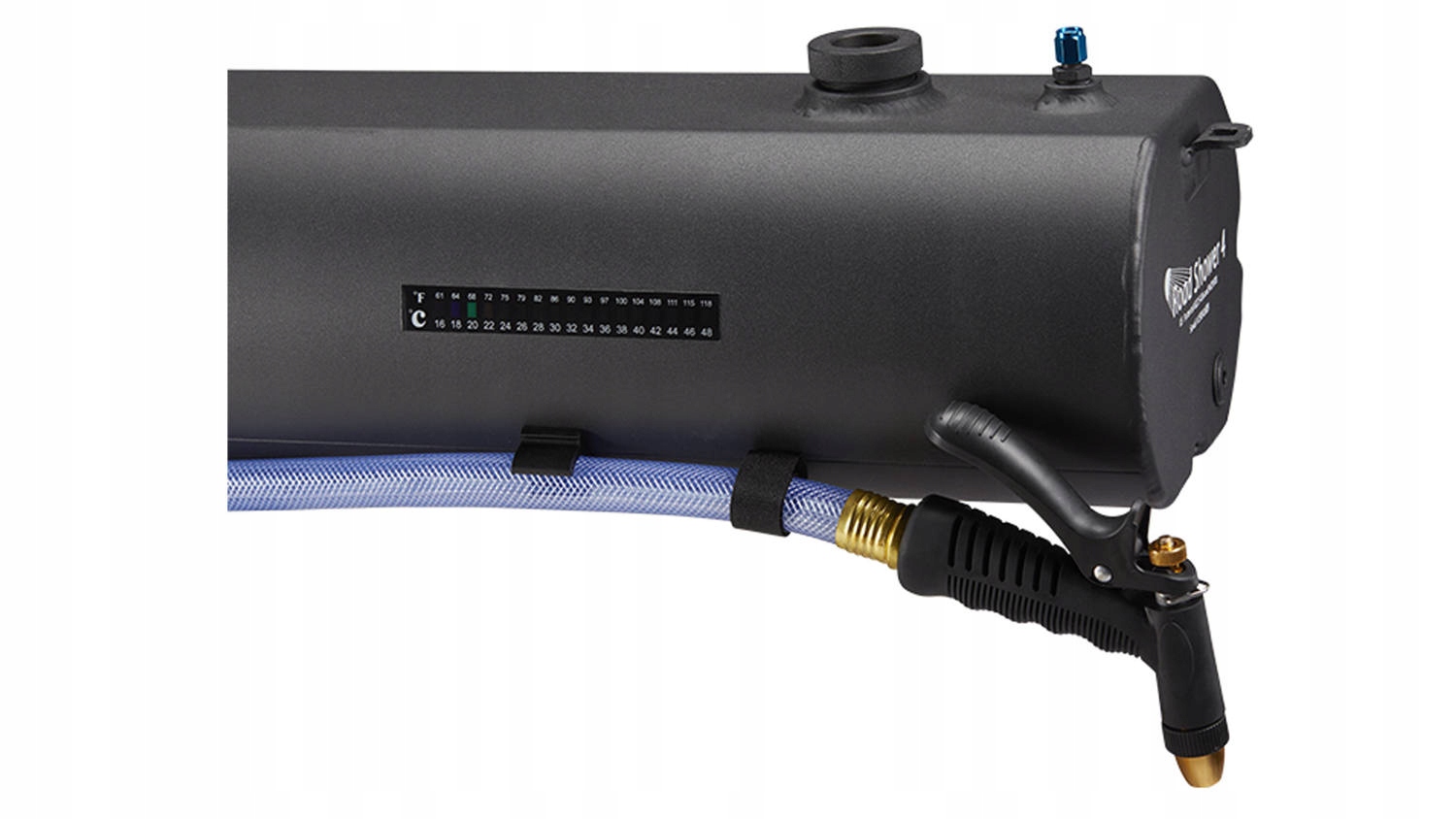 Надежное крепление к балкам базового багажника на крыше позволяет свободно пользоваться душем. Когда вы предаетесь своей страсти за пределами кемпинга, солнце нагревает воду в резервуаре. Размещенный на емкости термометр покажет вам температуру воды, поэтому вам не придется открывать кран, чтобы узнать, пригодна ли вода для купания.