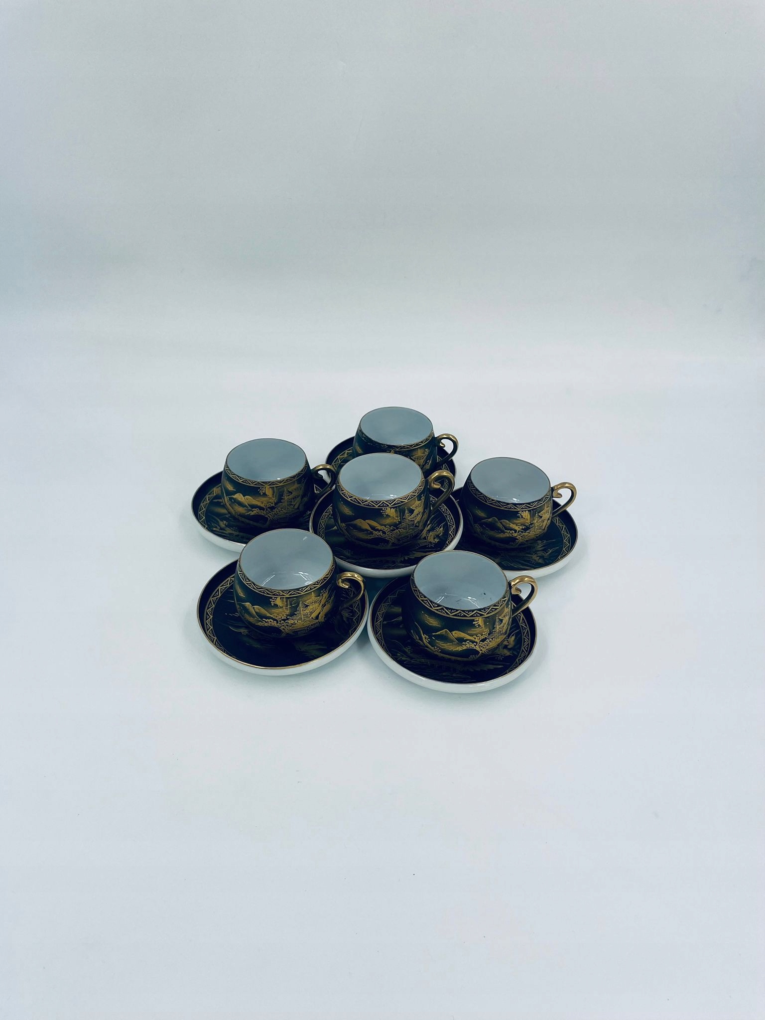 Набор завтрака японской чашки дуэта. Установите руку, поставленную в матовом черном с золотыми украшениями, изображающими пейзаж гор, здание храма и деревья с мостом, отделано с рисункой золотой полосы на верхнем краю и на крышке.