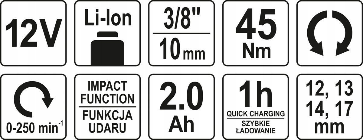 - В комплекте: аккумулятор YT-82909 2 Ач, зарядное устройство на 1 ч, розетки диаметром 12, 13, 14. и 17 мм с наконечником 3/8 дюйма и адаптером для самого популярного наконечника ½ дюйма.