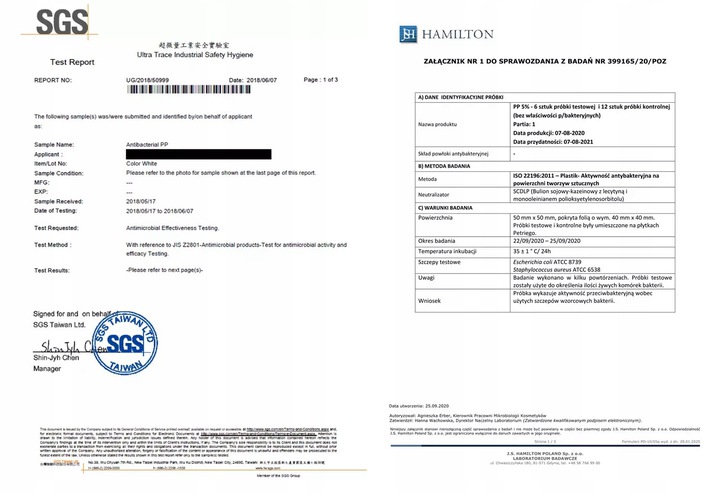 Продукт, протестированный аккредитованной исследовательской лабораторией, показал сильные антибактериальные свойства. Тест, проводимый для оценки антибактериальных свойств пластика и других непористых поверхностей. Испытания в соответствии со стандартом ISO 22196:2011.