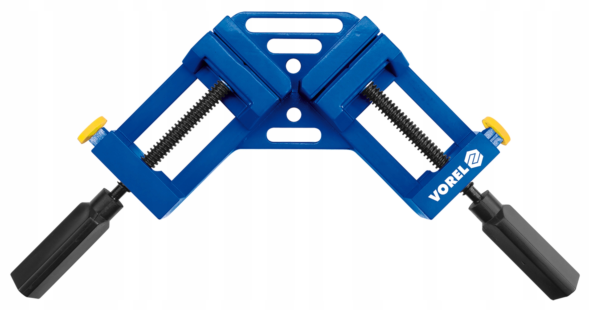 Специализированный столярный зажим, предназначенный для сборки угловых соединений. Чаще всего используется при склеивании рам. Устойчивая алюминиевая конструкция с двумя прижимными винтами позволяет монтировать и прижимать склеенные элементы под углом 90 градусов.