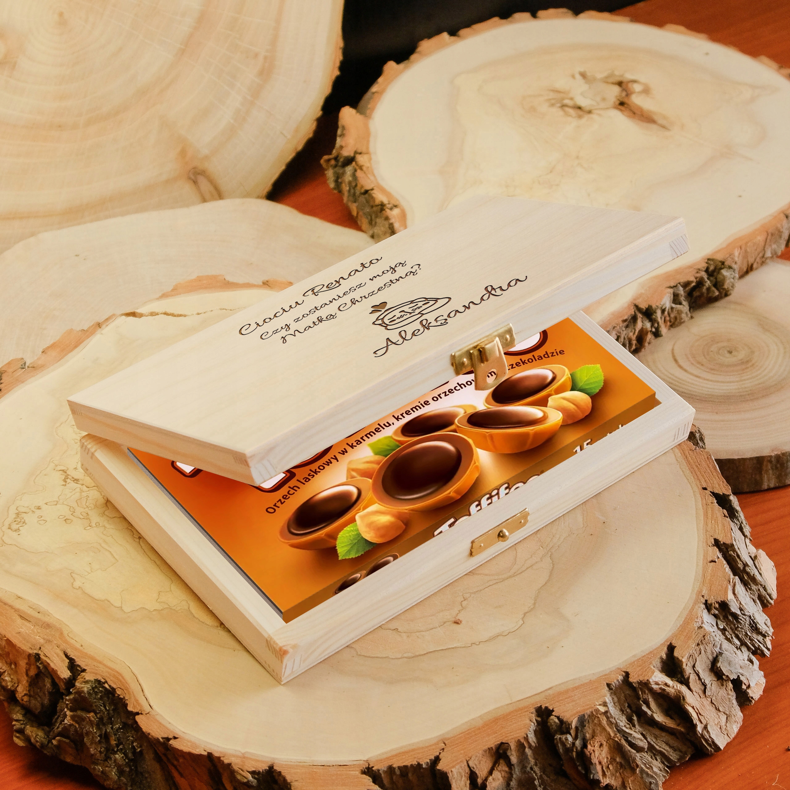 Коробка с персонализированной гравировкой на крышке — идеальная упаковка для небольшого подарка, например шоколада.