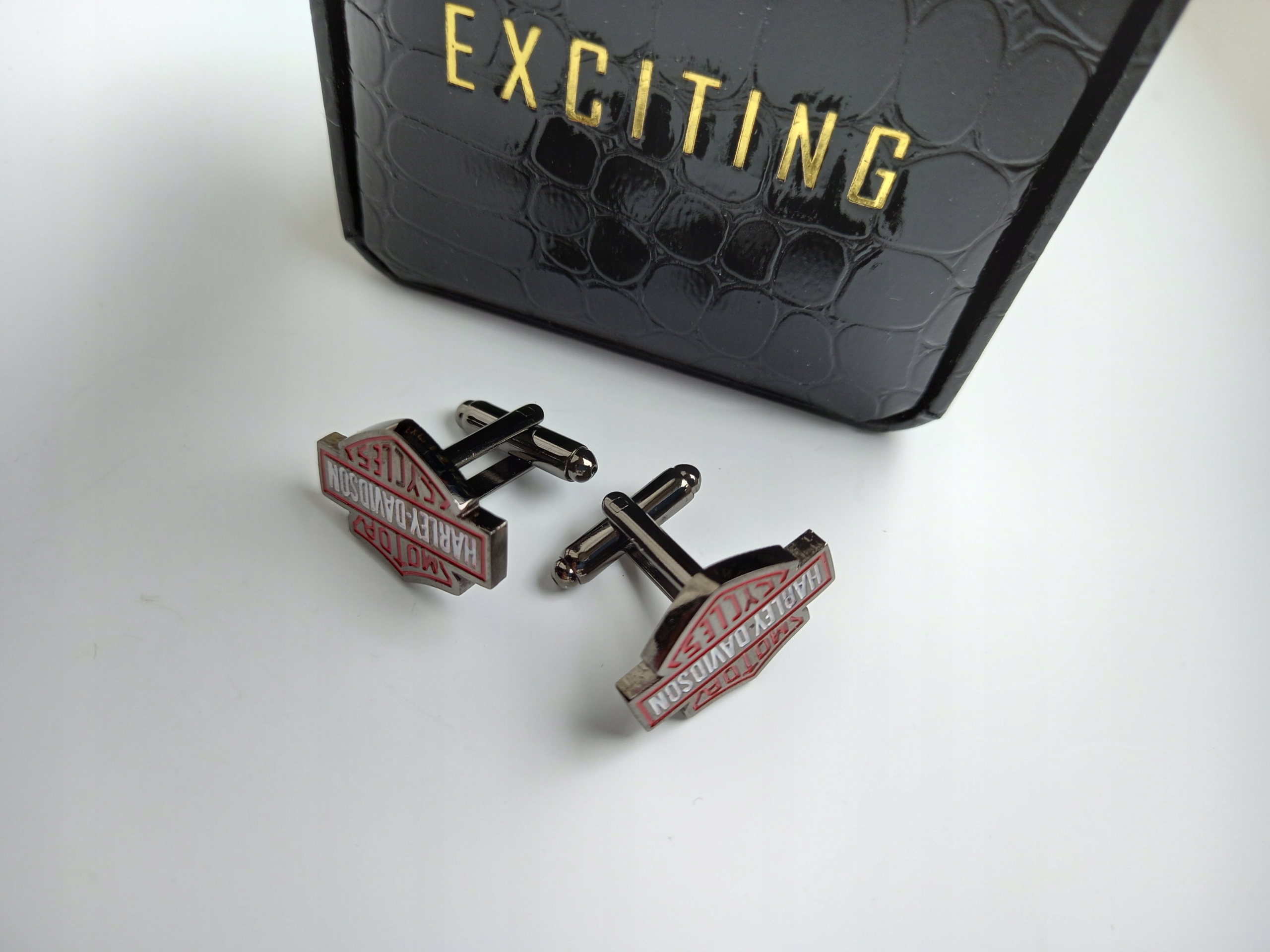 Красивый оригинальный комплект из пары запонок для рубашки от Exciting из эксклюзивной лимитированной серии Only for You. Запонки изготовлены из драгоценного металла титанового цвета с логотипом Harley Davidson Motorcycles.