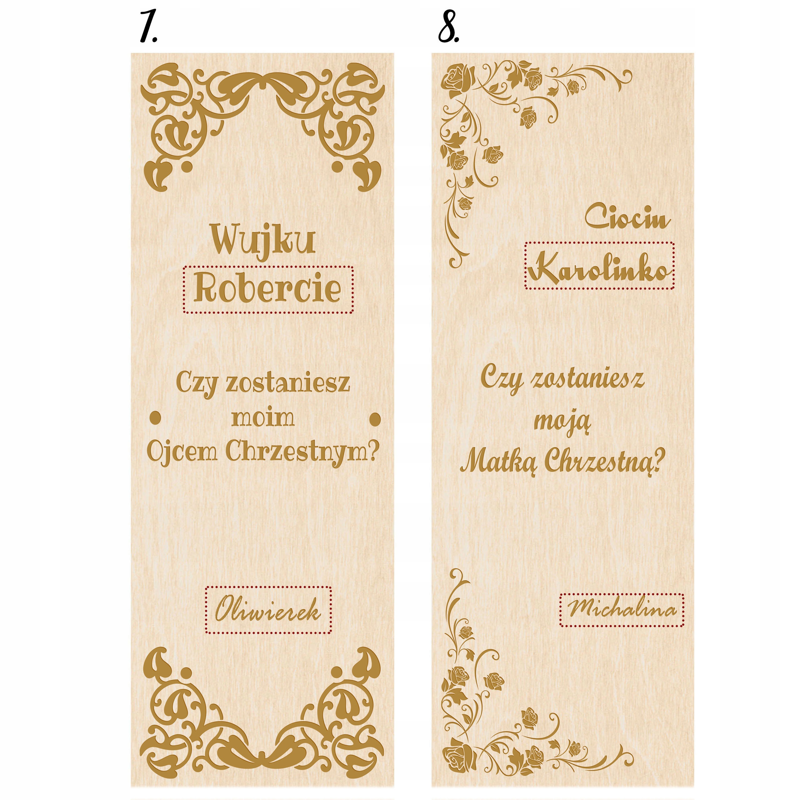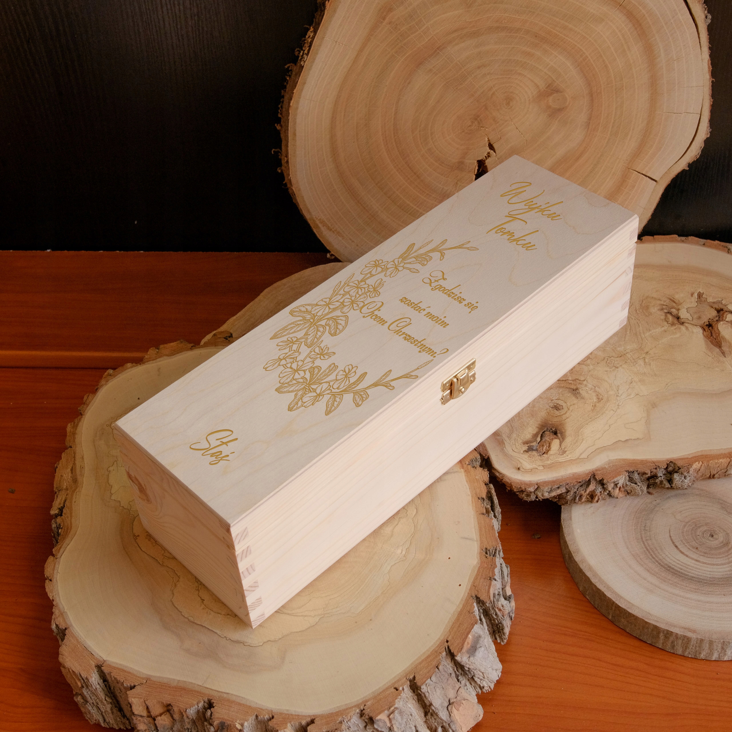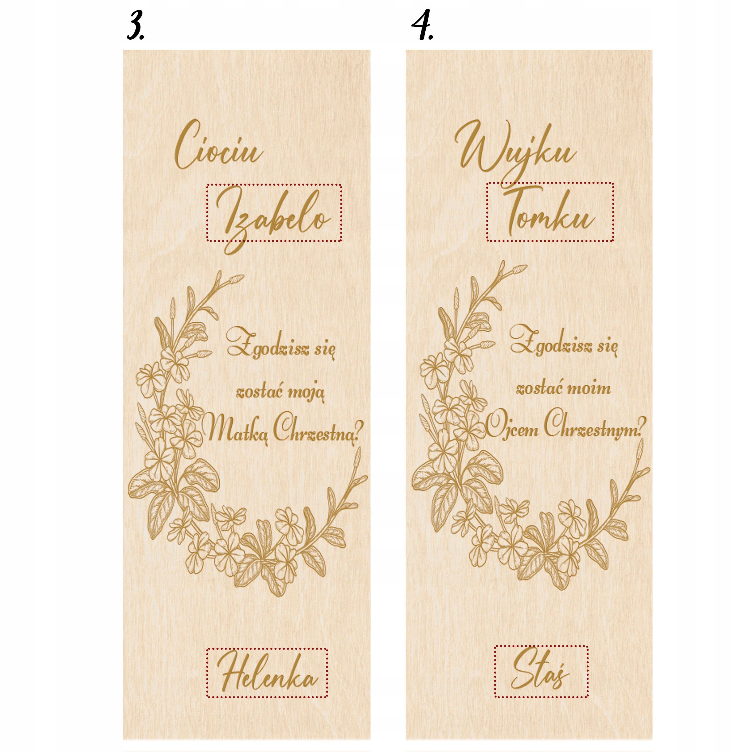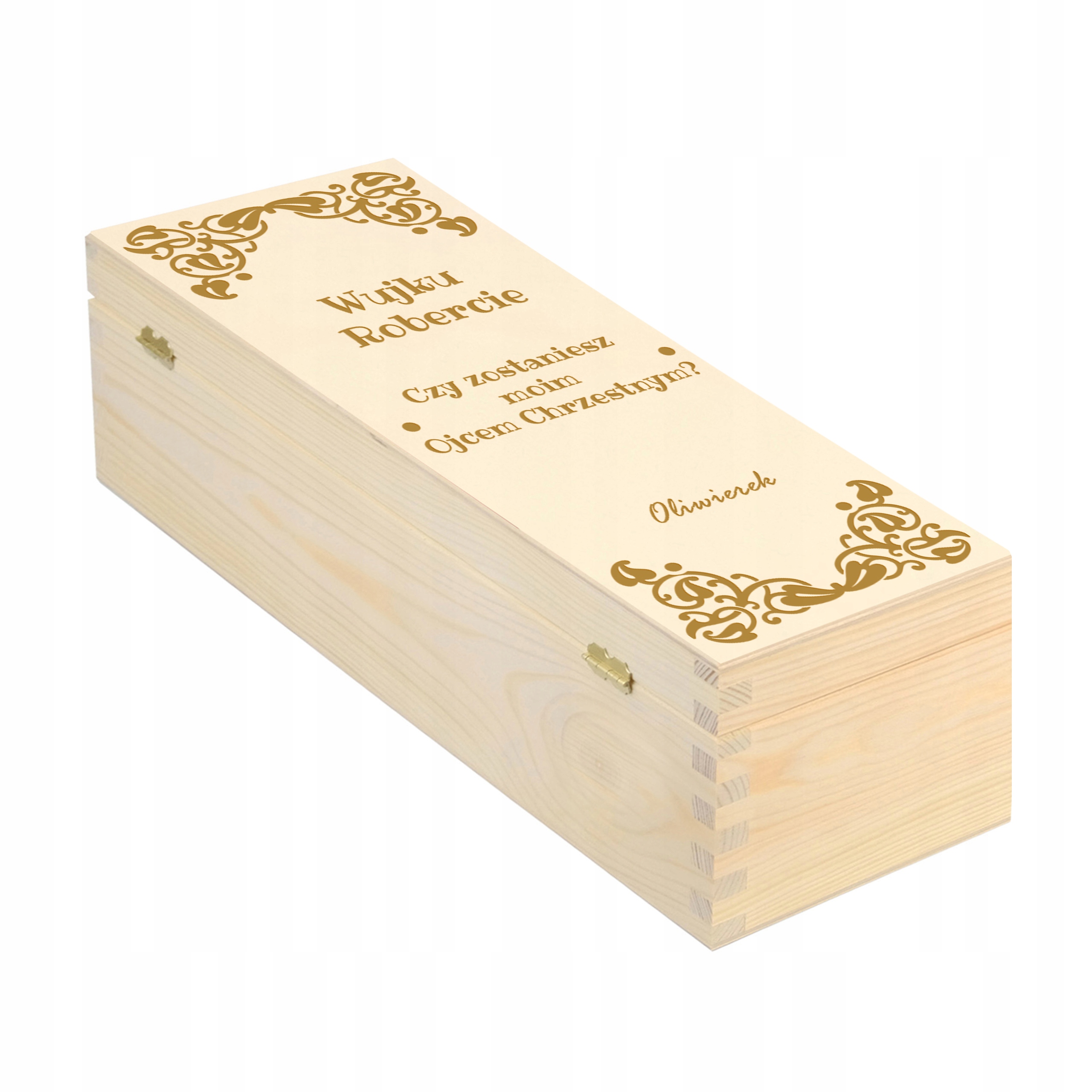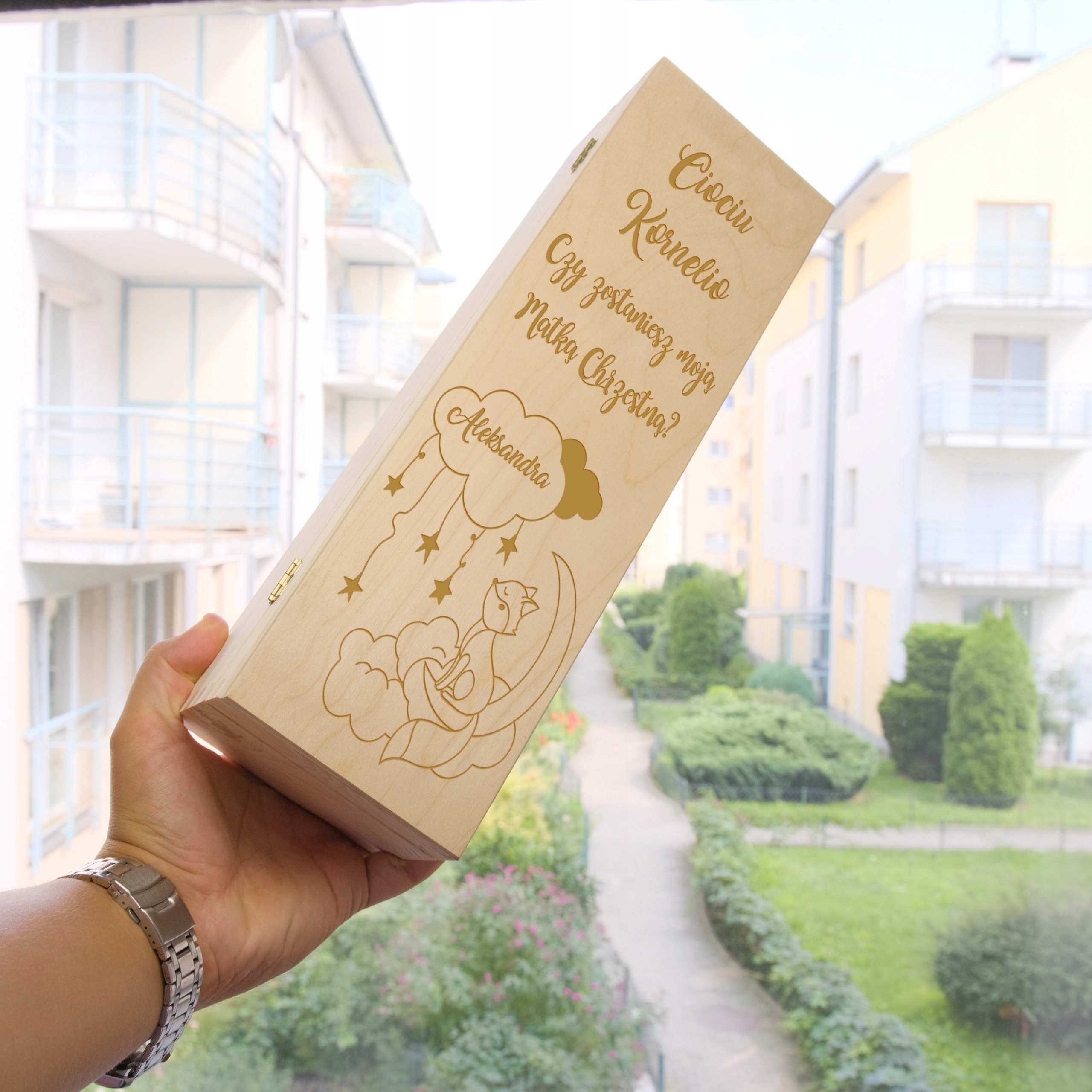 Коробка для вина — отличная идея, когда мы хотим задать очень важный вопрос. Гравировка на коробке – непростая просьба. Такой подарок подчеркивает важность события и ту роль, которую сыграют крестные родители для нашего ребенка.