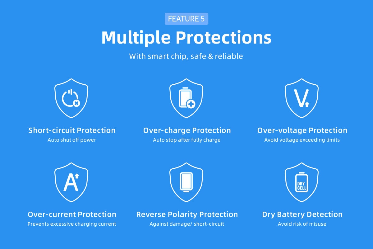 Защиты: от перегрева зарядного устройства, от перегрузки/короткого замыкания, от обратной полярности элементов