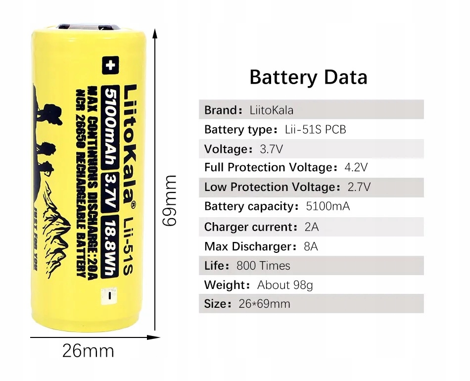 В комплект также входят два аккумулятора LiitoKala 26650 емкостью по 5100мАч каждый.