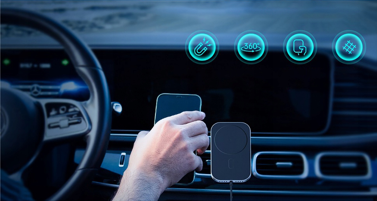 - Держатель для телефона с магнитным креплением и встроенным беспроводным зарядным устройством.