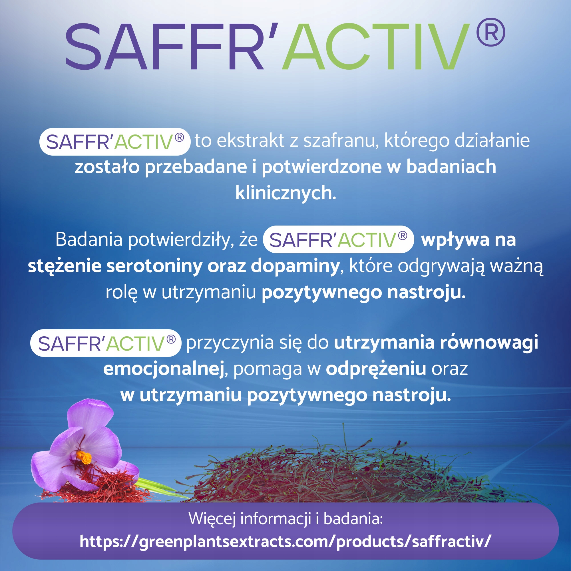 Saffr'Activ® - это клинически протестированный экстракт шафрана, разработанный на основе исследования его влияния на расстройства настроения. Он содержит активные соединения, такие как Krocin и Safranal, которые имеют антиоксидантные эффекты, помогают уменьшить симптомы снижения настроения, успокаивать стресс и улучшить качество сна