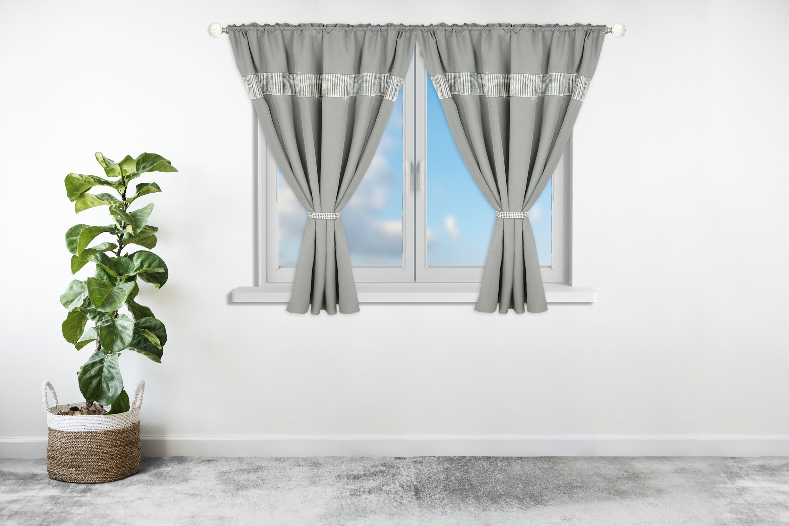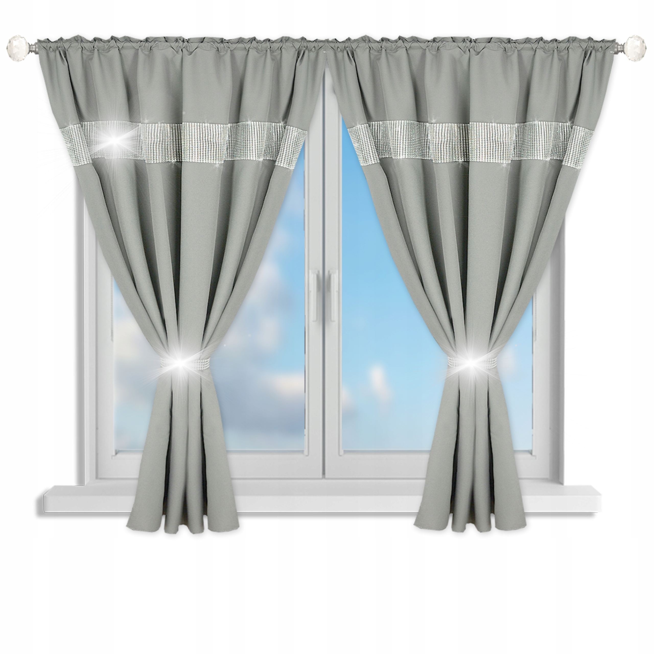 готов повесить занавес , сделанный из красивого серого, материала, украшенного большой полосой циркония шириной 12 см. Шторы были сделаны из материала с превосходными свойствами.