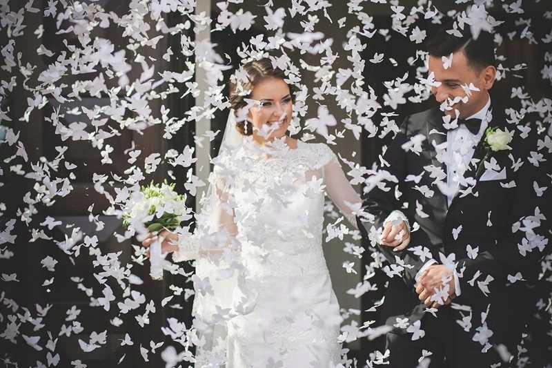 Съемка из трубки с розовыми лепестками – отличный эффект, когда жених и невеста выходят из церкви или в конце первого танца.