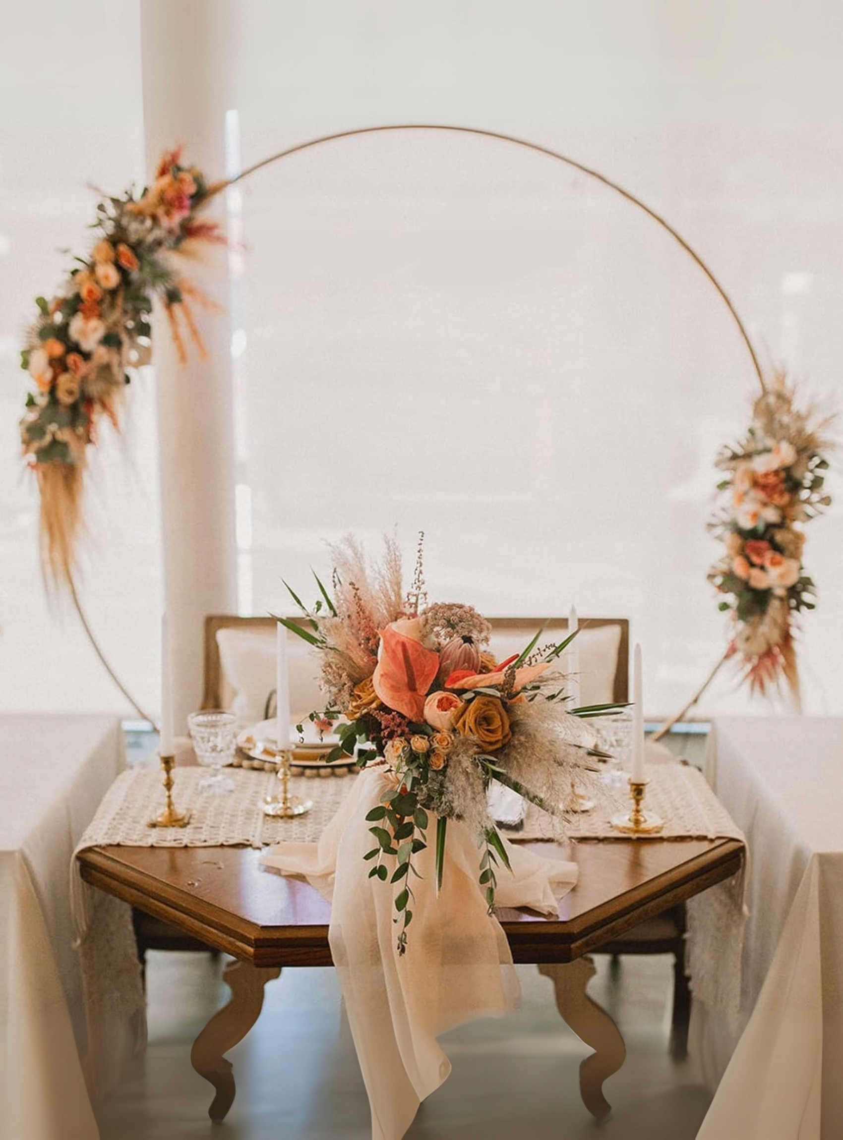 Золотая колесная рама представляет собой стильную декоративную добавление, что, безусловно, добавит элегантность к любой церемонии.