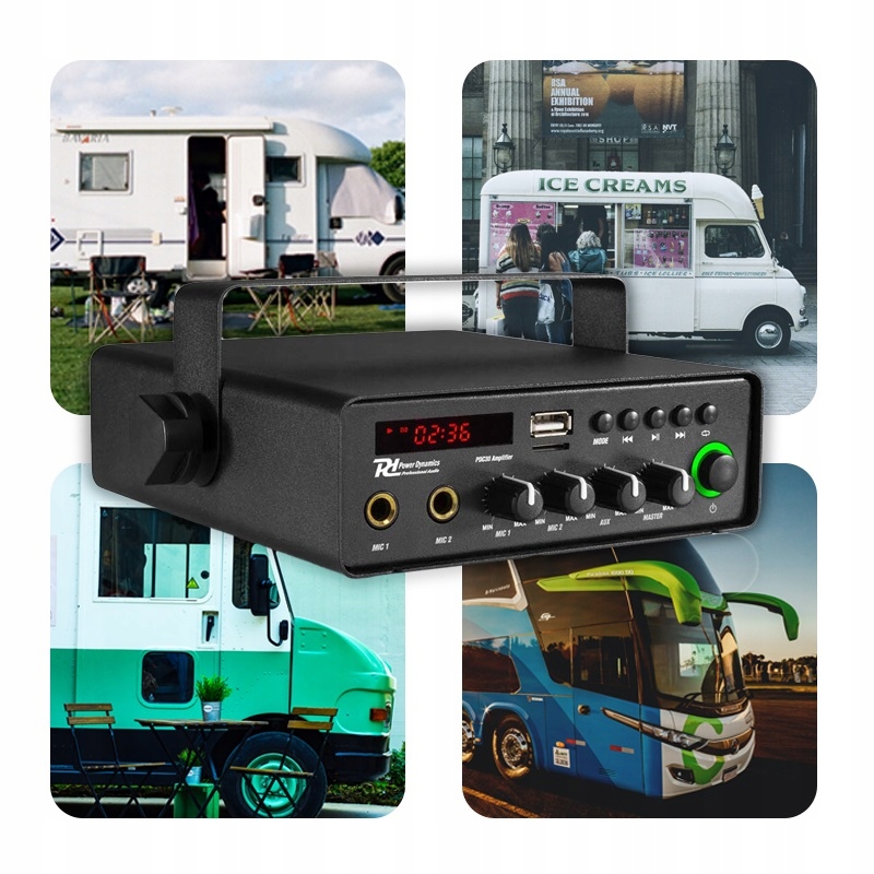 PDC30 — универсальный усилитель для стационарной и портативной установки. Его можно использовать как часть акустической системы в автомобиле или фургоне, а также использовать в помещении с питанием от сети. Он включает в себя два входа для микрофонов, например, для объявлений, а Bluetooth, встроенный MP3-плеер или разъем AUX можно использовать для воспроизведения музыки и записанных сообщений. Возможности этого усилителя делают его идеальным для использования с мобильной акустической системой в рекламных или маркетинговых целях с использованием автомобиля.
