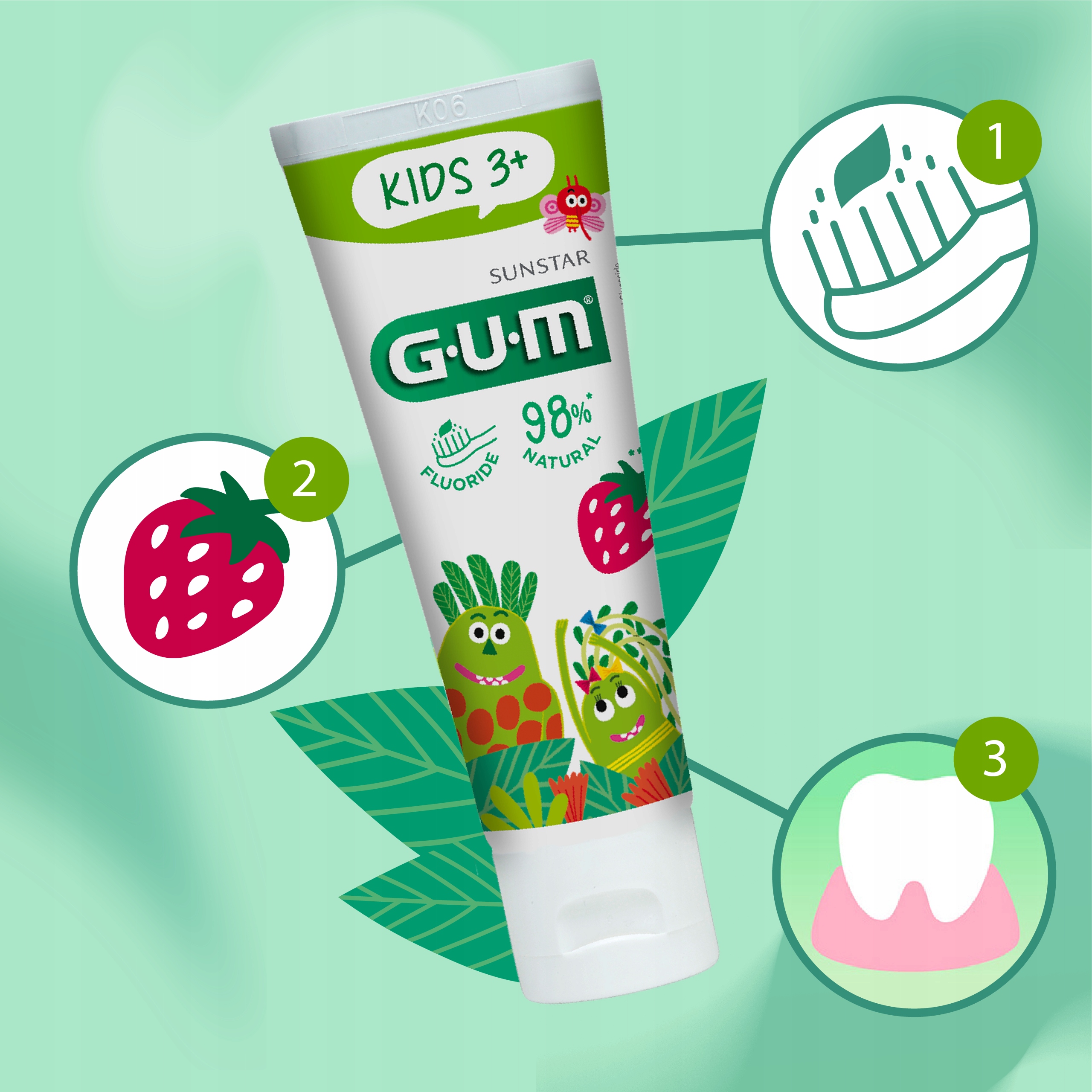 GUM® KIDS 3+ — это зубная паста для детей от 3 до 6 лет. Он содержит комбинацию двух специальных ингредиентов (фторида и изомальта), которые помогают укрепить эмаль и предотвратить разрушение зубов. Это идеальный выбор для ежедневной чистки молочных зубов!