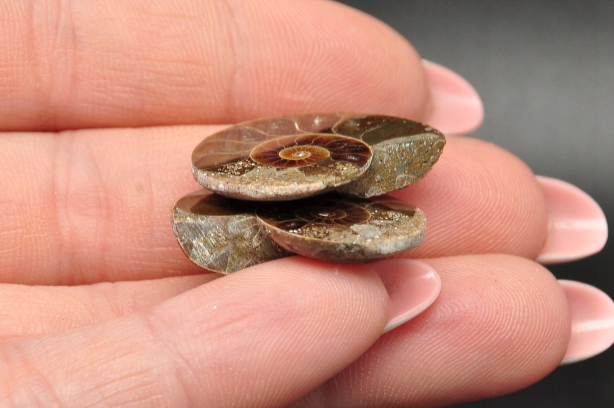 набір амоніту , красиво збережений зразок. Це копалини з Мадагаскара, датований нижчим крейдовим періодом. Унікальний зразок вирізання та відшліфованого одного. 2,5 х 2 х 0,6 см / 2,5 х 2 х 0,7 см