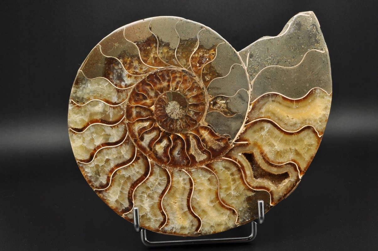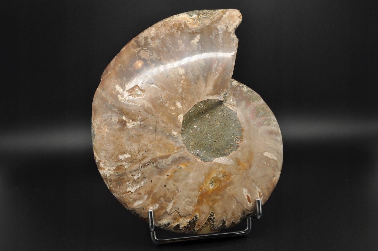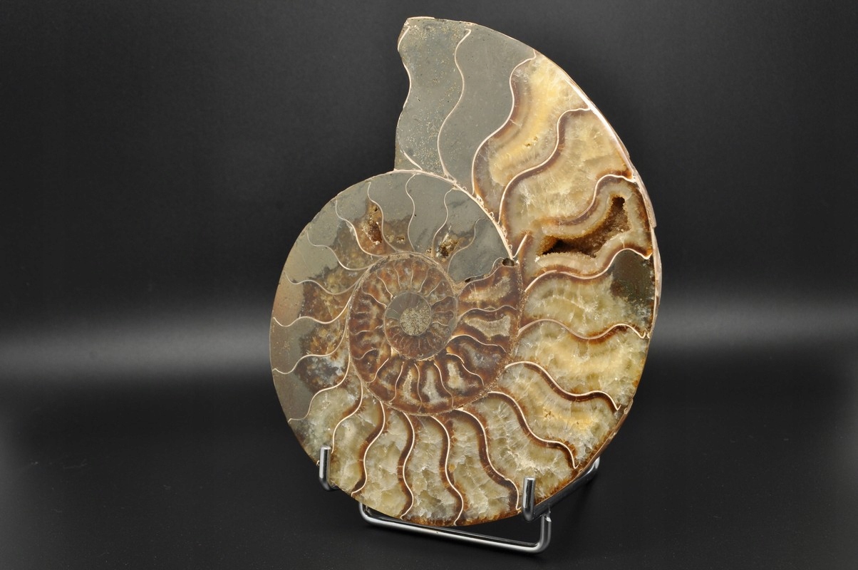 ПОЛОВИНА АМОНІТУ, ПРАЙДОВО ЗБЕРЕЖЕНИЙ ЗРАЗОК. ЦЕ ВИКОПАЛИВОСТІ З МАДАГАСКАРУ, ДАТУВАНІ ПЕРІОДОМ НИЖНЬОГО КРАЦЕТАГО. АМОНІТ МАЄ КАМЕРИ, ЯКІ ЗАПОВНЕНІ КАЛЬЦИТОМ, А ДЕЯКІ З НИХ УТВОРЮЮТЬ КАЛЬЦИТОВІ ЖЕОДИ. ВЕЛИКИЙ УНІКАЛЬНИЙ ЗРАЗОК, ОДНІЙ СТОРОНУ ВІДРОЗАНИЙ ТА ВІДПОЛІРОВАНИЙ.