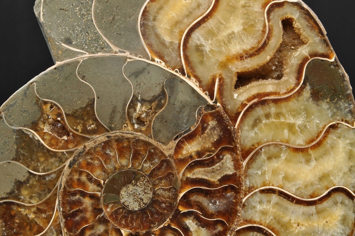 Амоніти, амоніти (Ammonoidea) - підклас вимерлих головоногих молюсків (Cephalopoda), зазвичай із симетричною, плоскоспіральною раковиною. Деякі типи мали незвичайні форми, наприклад, пряма оболонка, вертикально закручена спіраль або спіраль з безконтактними витками. Вони зустрічаються в гірських породах морського походження, що датуються девонським періодом до кінця крейдяного періоду. Деякі окремі камери відкриті та заповнені багатим асортиментом сіро-бежевих і коричневих кристалів кальциту з перегородками між камерами.
