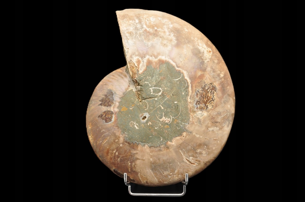 Аммоніти , амоніт (Ammonaidea) - підгрупа вимерлих головоногих (цефалопода), як правило, з симетричною, плоскою -імпортованою скоринкою. Нечисленні типи мали незвичайні форми, наприклад Проста оболонка, спіраль, згорнута вертикально, спіраль з незручними поворотами. Вони трапляються в скелях морського походження від періоду від Девона до кінця крейди. Деякі з окремих камер відкриті та наповнені багатим набором бежевих сірого та коричневого кальцитового кристалів, з перегородками між кожною камерою.