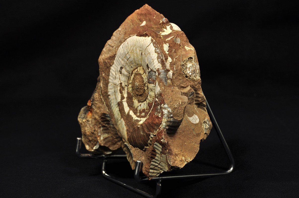 Амоніти, амоніти (Ammonoidea) - підклас вимерлих головоногих молюсків (Cephalopoda), зазвичай із симетричною, плоскоспіральною раковиною. Деякі типи мали незвичайні форми, наприклад, пряма оболонка, вертикально закручена спіраль або спіраль з безконтактними витками. Вони зустрічаються в гірських породах морського походження, що датуються девонським періодом до кінця крейдяного періоду. Деякі окремі камери відкриті та заповнені багатим асортиментом сіро-бежевих і коричневих кристалів кальциту з перегородками між камерами.