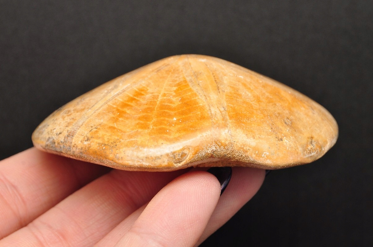 4 Він був дуже відполірований, щоб витягувати деталі району і походить від покійного присяжного, близько 160 мільйонів років тому. Піщаний долар - це дуже сплющена форма їжака кліпероїдів. Як Скарбін, вони мають п’ять разів симетрію організації тіла, водна судинна система та внутрішній скелет, виготовлений з кальцитових пластин. Вони живуть у неглибоких морських середовищах трохи нижче зливної лінії, закопані в піску або грязі. У них діаметр приблизно до 4 дюймів (10 см). Більшість із них мають товщину приблизно третину (7 мм) до половини (12 мм) дюйма, але деякі - товщина понад дюйма. Вони мають принципово круглу форму, хоча деякі сплющені або відступні сторони. Протягом життя вони покриті оксамитовими -виглядаючими шипами, які вони рухають, як і інші дефіцитні. Найбільш діагностичний показник викопних піщаних доларів -це п’яти -жовта форма у верхній частині скелета. Вони є частиною дихальної системи і залишають легко впізнавану «квітку» на скелеті. Вони є активними хижаками, годуючи личинок ракоподібних, невеликої пустелі, діатомів та водоростей.
