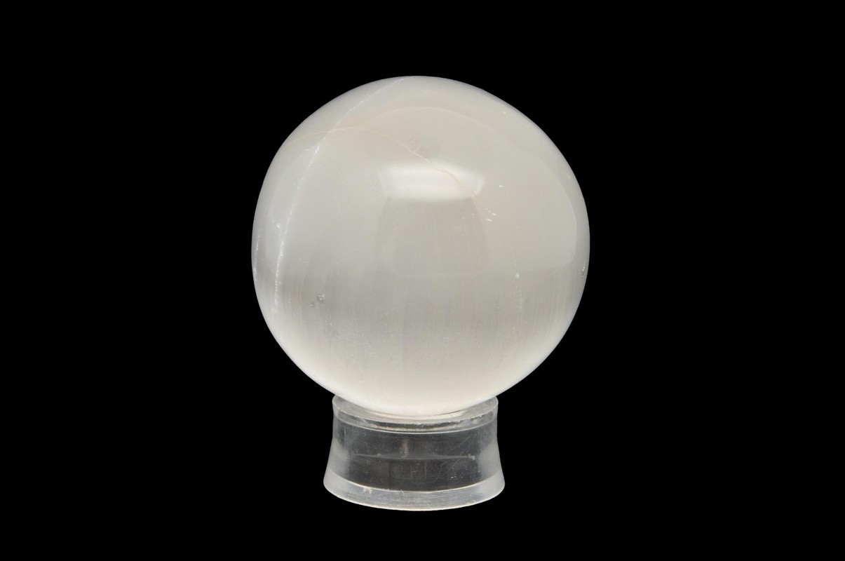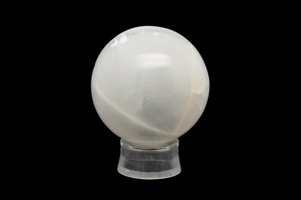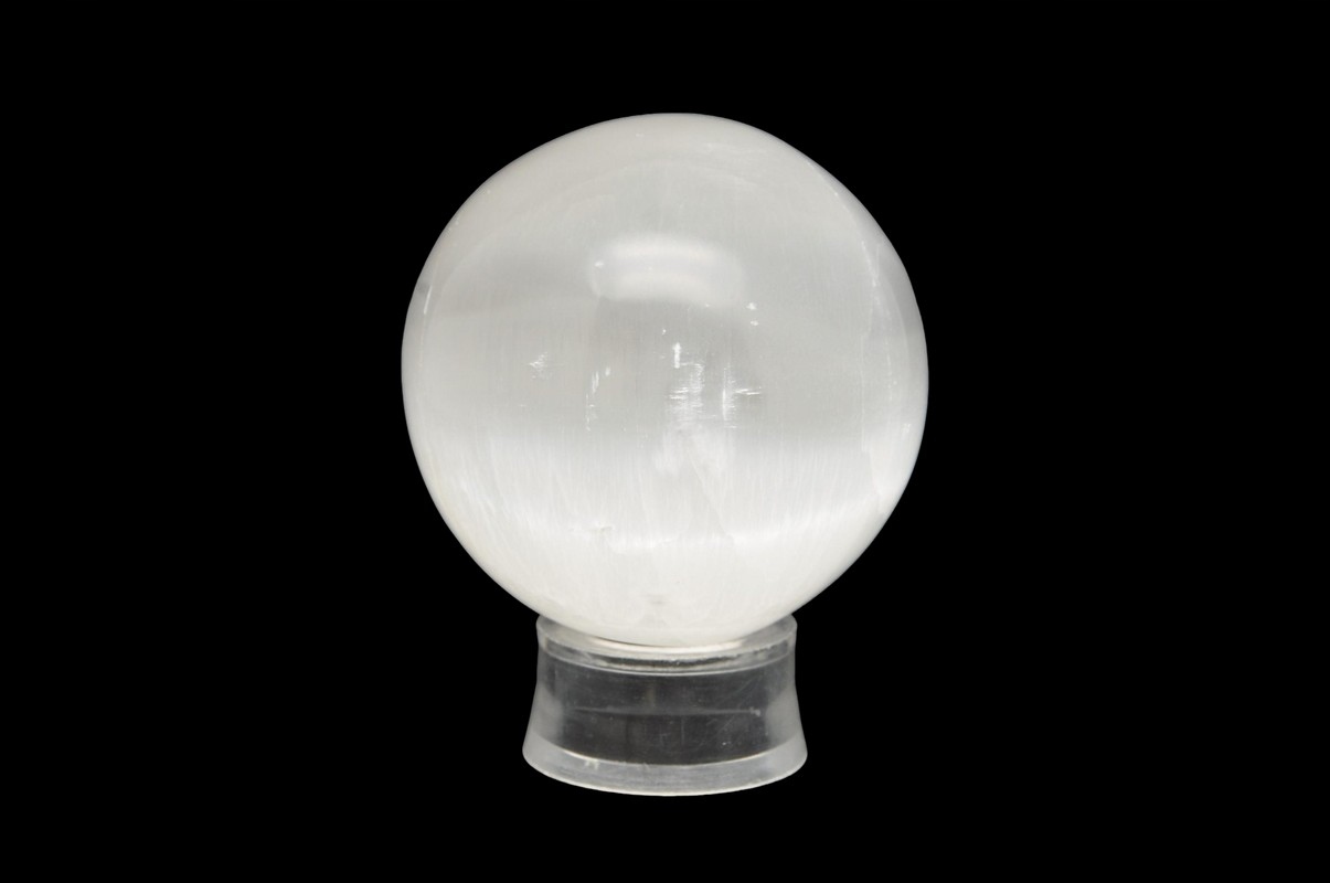 натуральний селеніт у вигляді кулі, волокнистої різноманітності штукатурки, що демонструє місячне сяйво. Чудова якість, прекрасний малюнок. Земневий зразок ідеально підходить для подарунка і як прикраса.