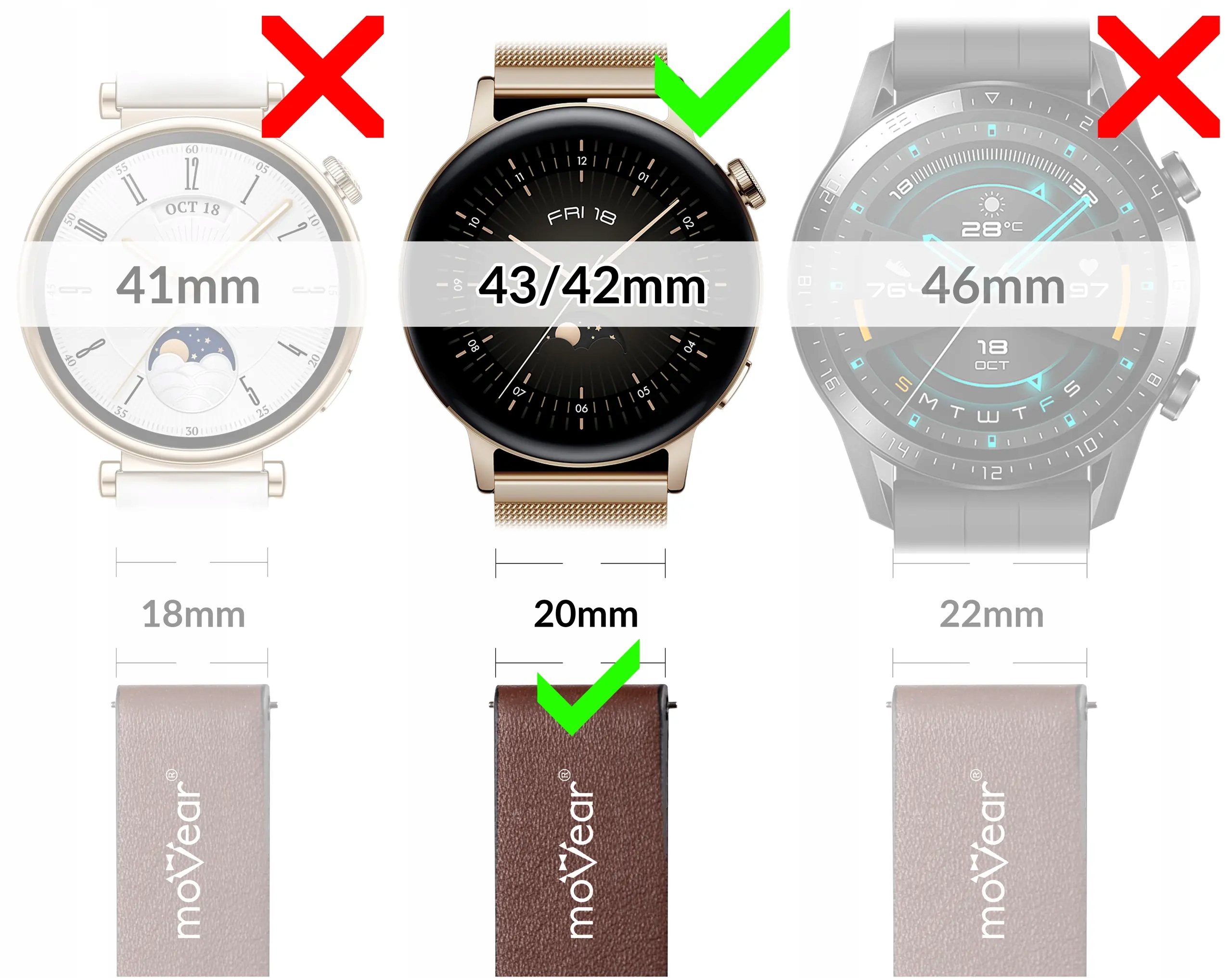 Зверніть увагу на точну модель та розмір годинника. смарт -годинники Huawei поставляються у трьох розмірах конверта 49/48/46/43/43/42/41 мм. 20 мм від пропозиції вписується лише з Huawei Watch з кріпленням ремінця ширини 20 мм: