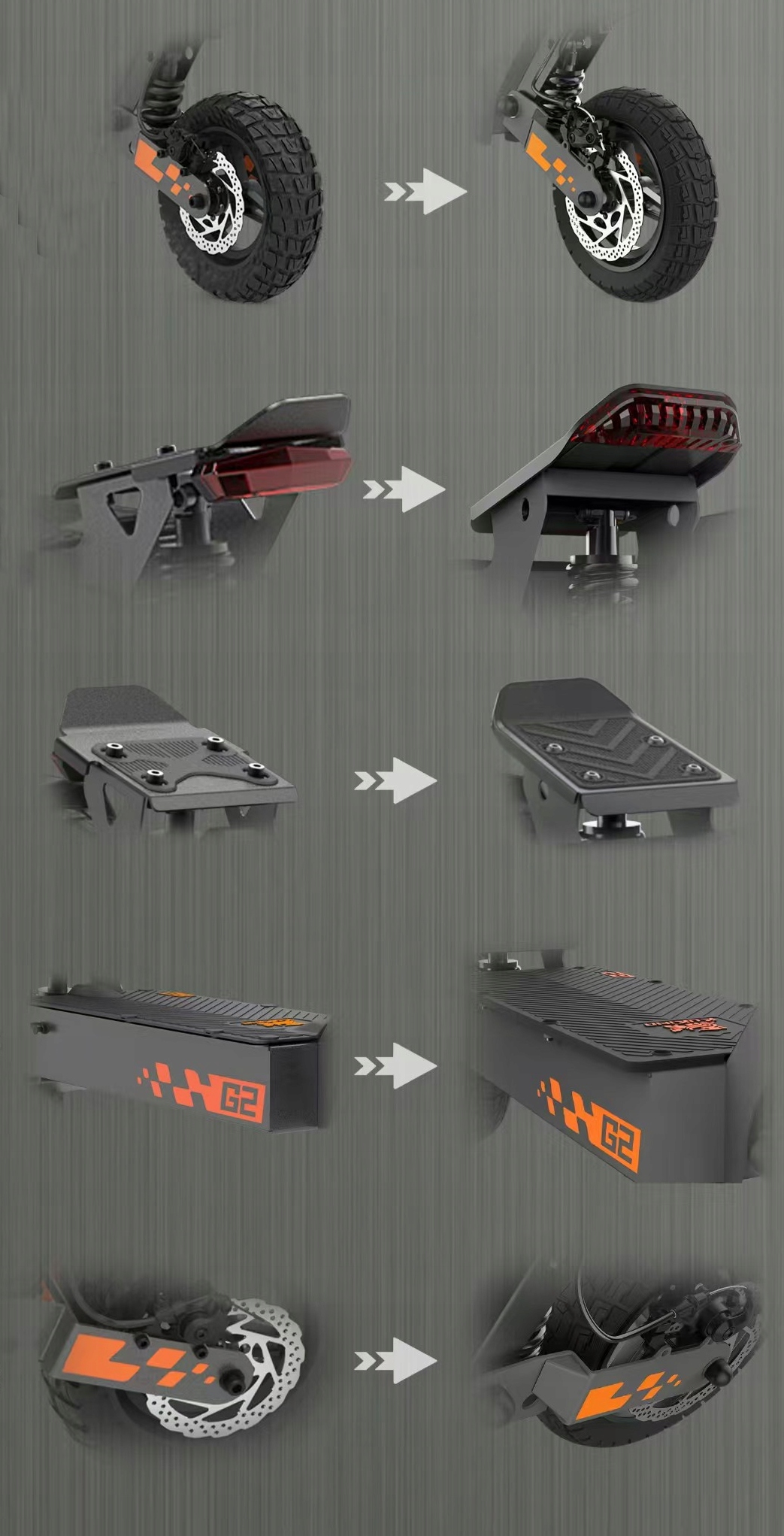 1 Вдосконалення вилки та гойдалки: ми замінили вилку та гойдалки абсолютно новими, що значно збільшило їх силу, завдяки якому транспортний засіб є більш стабільним та надійним у складних дорожніх умовах. Один -дизайн педалі: Новий G2 має нову структуру педалі, яка не тільки покращує естетику, але й значно збільшує водостійкість, забезпечуючи більш безтурботне водіння. Поліпшення гальмівної системи: Ми повністю оптимізували гальмівну систему, замінюючи ручку гальма новою версією, збільшуючи контактну поверхню між гальмівними дисками, гальмами та блоками та потовщуючи гальмівні лінії, щоб отримати ще кращий гальмівний ефект та безпечніший водіння. Потовщення задніх дверей та зміна матеріалу корпусу фари: Для подальшого підвищення стабільності та довговічності транспортного засобу ми спеціально потовщували задні двері та змінили об'єктив фари на матеріал ПК, що означає, що вся структура транспортного засобу є більш міцною, покращує довговічність, щоб запобігти тріщинам і тривати довше.