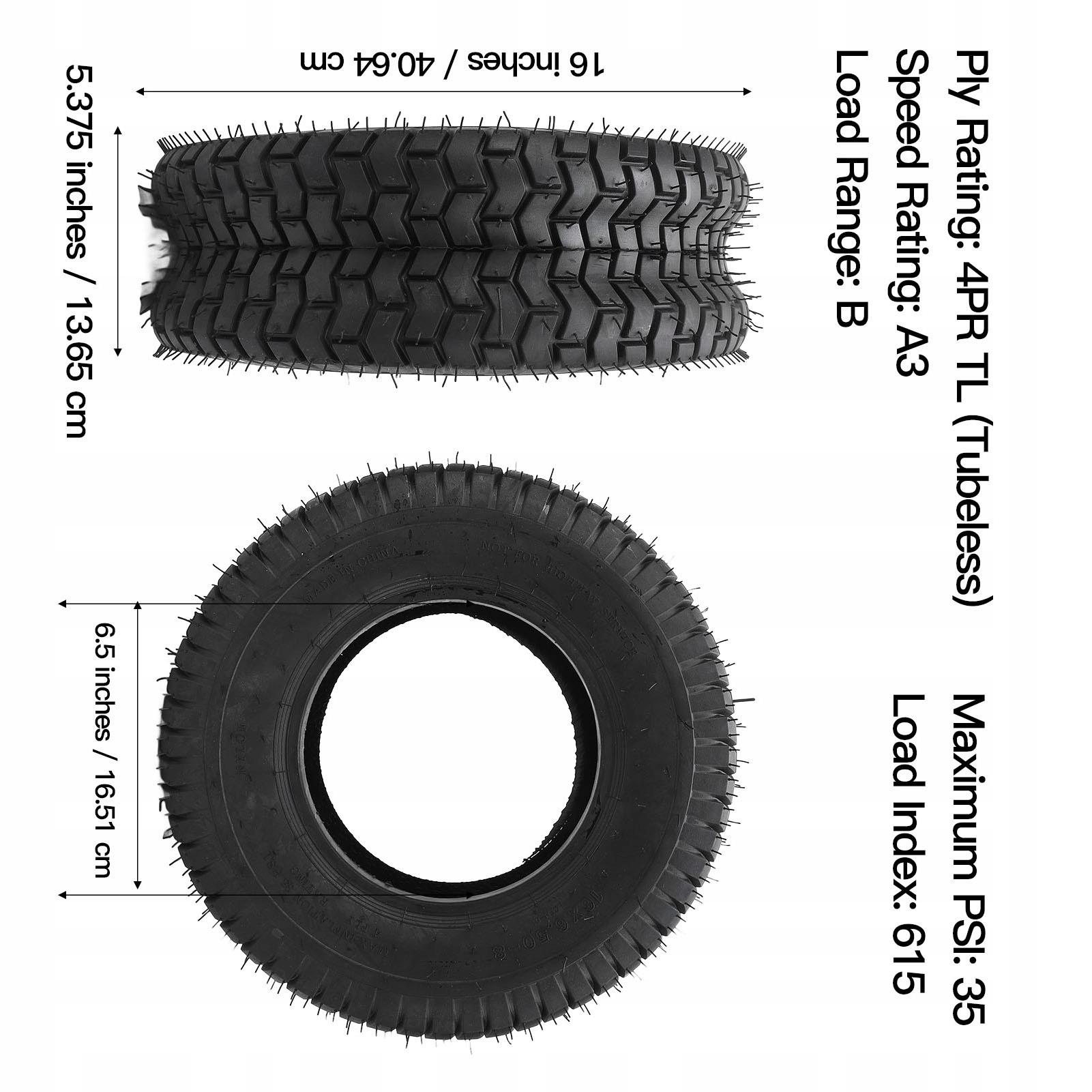 2. Висока вантажопідйомність: з діапазоном навантаження 4PR /B, індикатором швидкості A3 та максимальним навантаженням 615 фунтів /35 фунт /кв.дюйм, наші шини 16x6,50-8 можуть витримати будь-яке використання високої роботи.