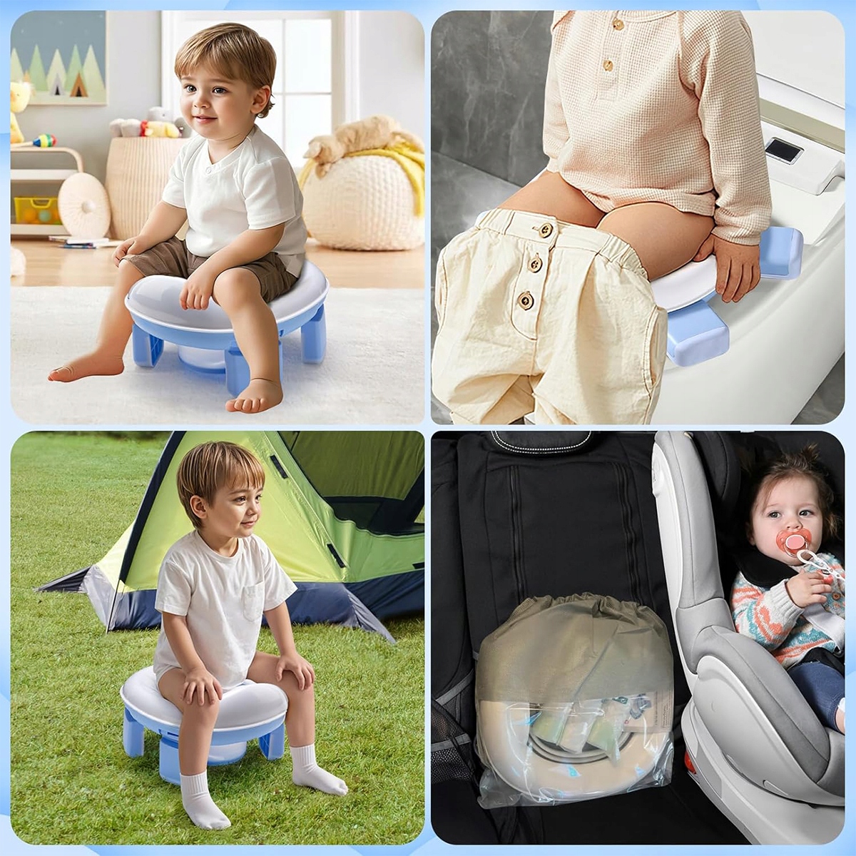 🚗【 Багатофункціональна】 3 в 1 Подорожній горщик можна легко використовувати в машині, в парку та інших місцях зовні, забезпечуючи ідеальне рішення в бентежних та тривожних ситуаціях у подорожах. У горщика є безпечний замок для ніг у випадку надзвичайних ситуацій або як туалет для дітей. Гума, що не належить до ковзання, забезпечує певний зчеплення.