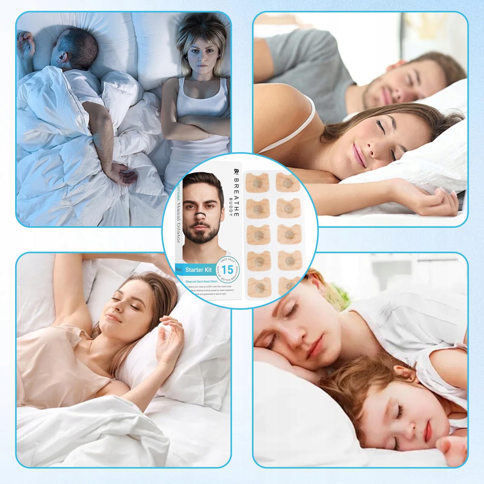 Ви можете легко насолодитися природним полегшенням у носовій переваленні. По -перше, просто очистіть обидві сторони носа. Потім, використовуючи нашу прикріплену наклейку на ніс, легко приклеїти магнітну стрічку з кожного боку чистим сухим носом. Нарешті, просто прикріпіть прикріплений чорний затискач на носі з обох боків носового променя. Після цього у вас буде добре спати.