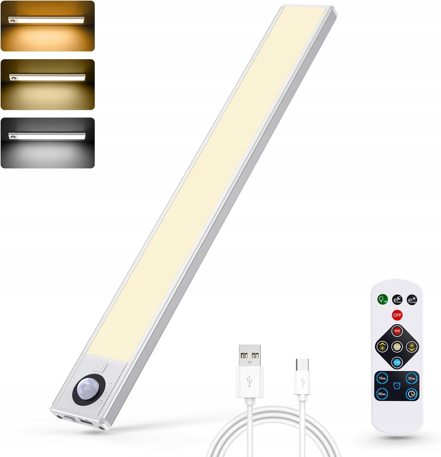 Ця лампа для шафи, що перезаряджається, оснащена бездротовим радіопультом дистанційного керування. Освітлення шафи з датчиком руху з такими функціями, як синхронізація, перемикання, затемнення та пам'ять. Налаштування режиму: ніч/день/завжди увімкнено/вимкнено ② Регулювання яскравості: натисніть кнопку «+/-» на пульті дистанційного керування. Регулювання колірної температури: холодне біле світло, нейтральне світло, тепле біле світло. ④ Функція таймера: 15, 30 або 60 хвилин.