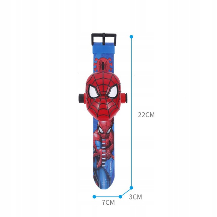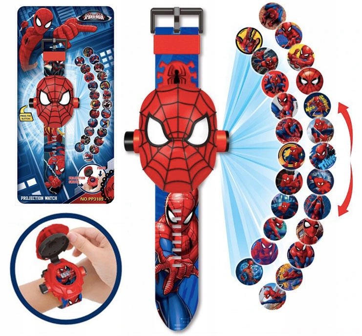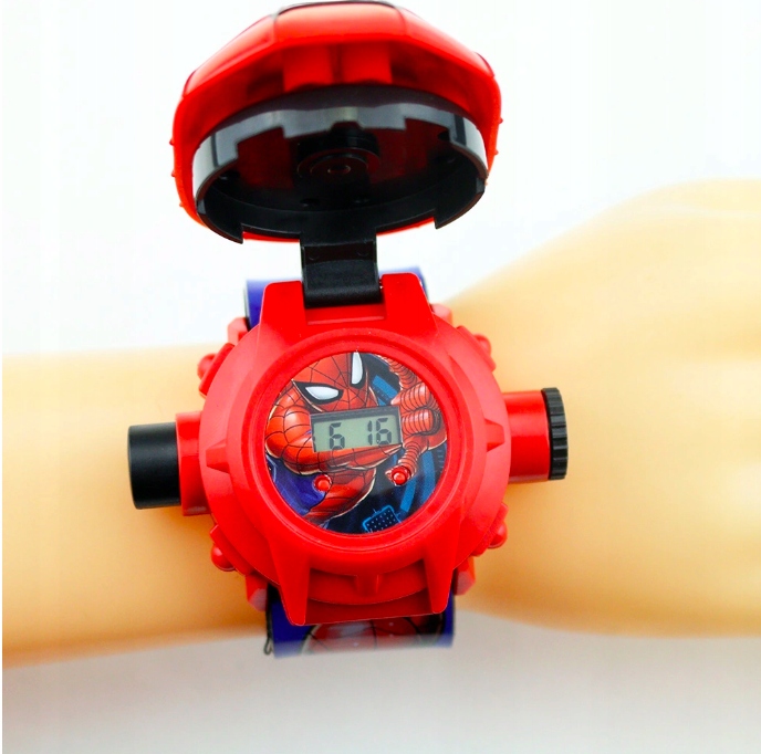 Годинник має проектор для відображення 24 картинок з фільму "ЛЮДИНА-ПАВУК". Щоб відобразити зображення, просто утримуйте кнопку збоку годинника, а потім повертайте ручку, щоб відрегулювати чіткість зображень, що відображаються.