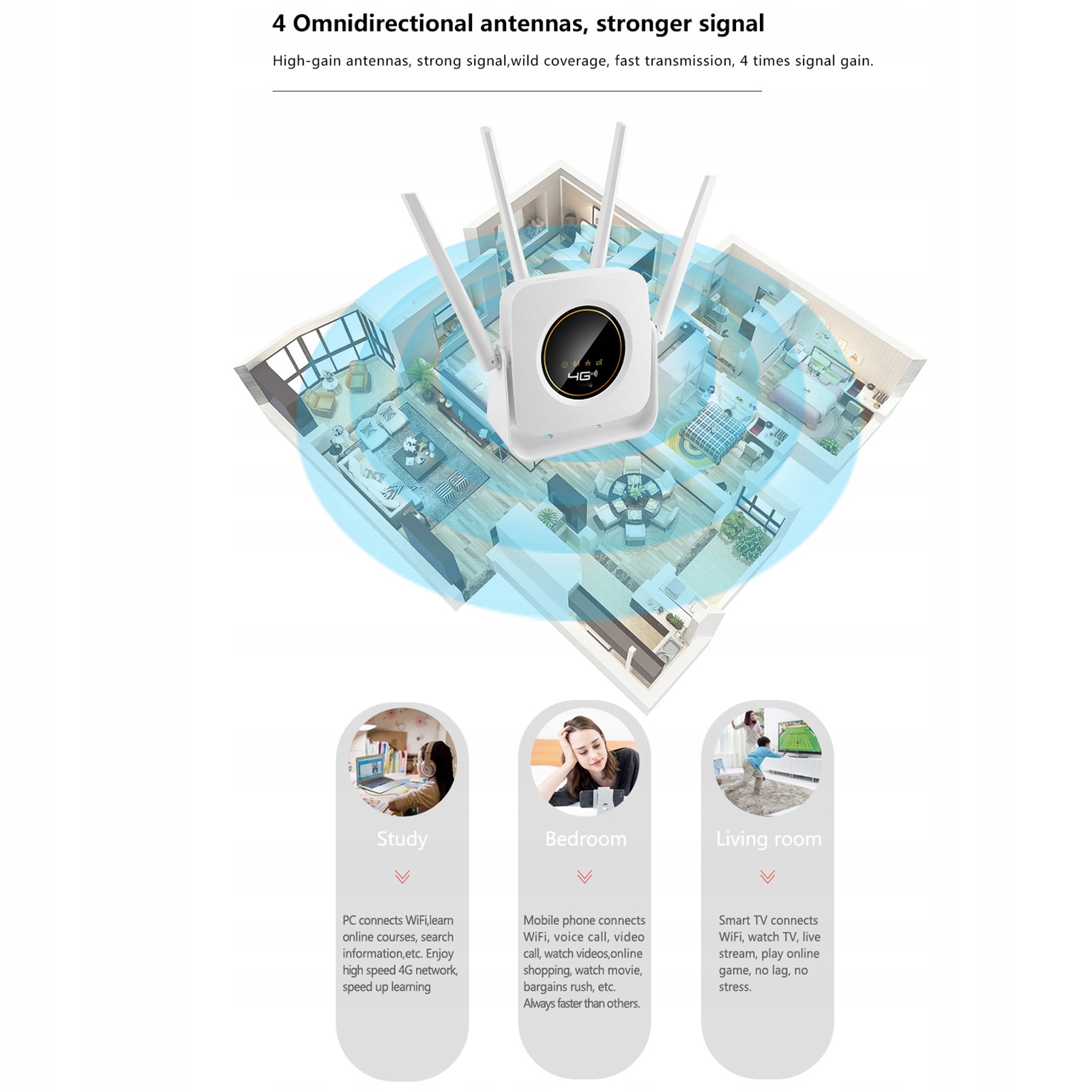 1. 4G LTE Wireless Router: Ви можете отримати доступ до Інтернету через UMTS HSPA LTE, маршрутизатор 4G з SIM -карткою, також має функцію перетворення 4G до Hotspot Wi -Fi, він може охопити 300-500 метрів одночасно, ви можете підключитися до 32 пристроїв у той самий час, що ідеально підходить для домашнього, використання.