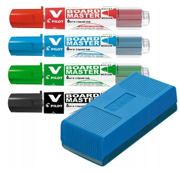 Набір із 4 сухостираючих маркерів Pilot V-BOARD Master з круглим кінчиком + магнітна губка Pilot WBMA-V