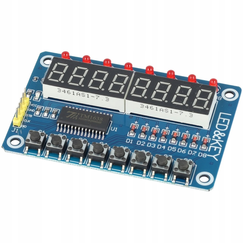 модуль світлодіодного відображення з 8 цифрами, кнопками та світлодіодами на основі контролера TM1638 - ідеальний інструмент для створення інтерактивних електронних проектів. Вмикає одночасне управління дисплеєм, світлодіодами та кнопками, без великого навантаження на мікроконтролер, що робить його універсальним рішенням.