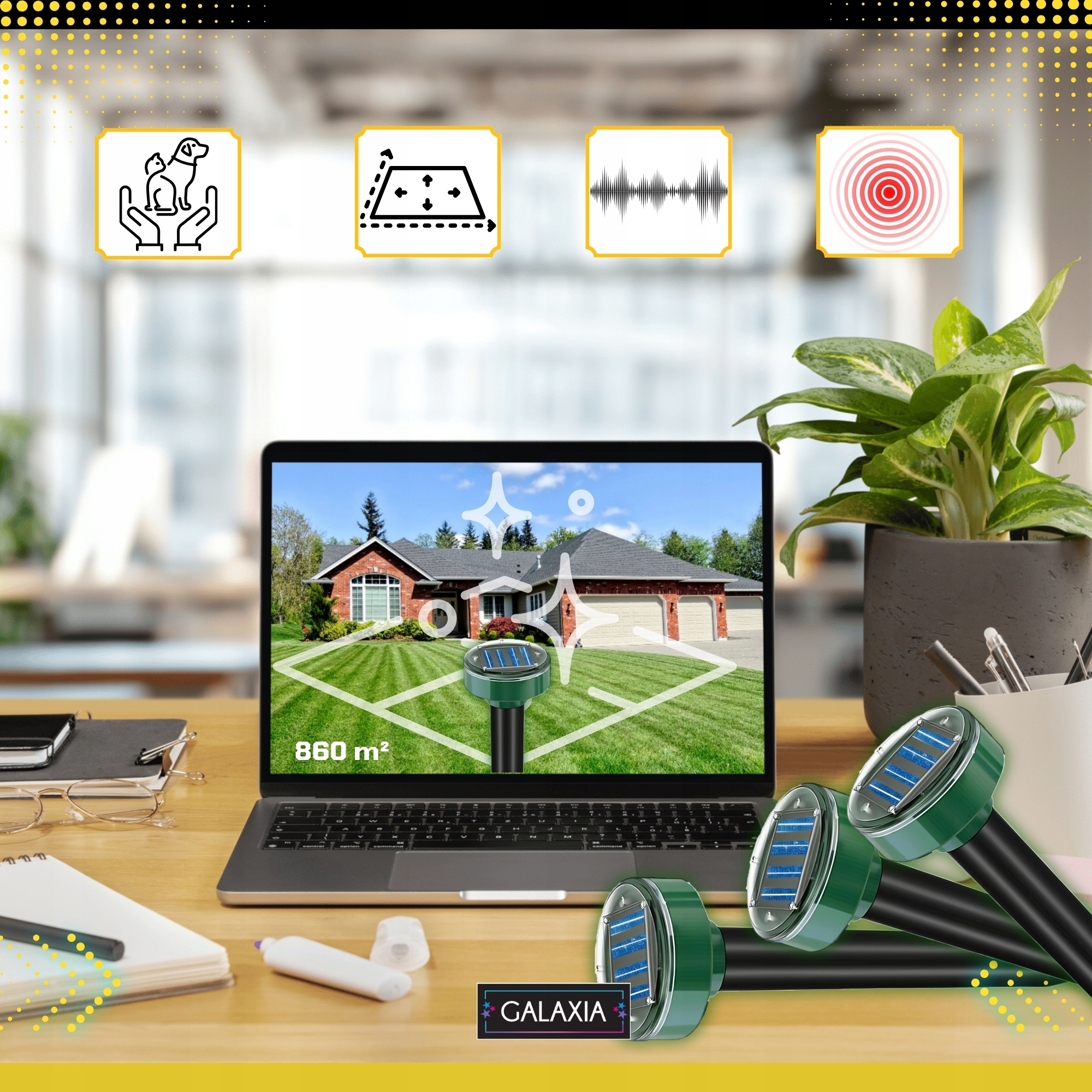 - ➡ Екологічні технології у вашому саду! Galaxia® Repeller використовує натуральне сонячне світло для живлення вбудованого акумулятора - без необхідності замінити акумулятор або підключення кабелю. Захист 24/7! Вже 4 години зарядки на сонці достатньо, щоб пристрій працював до 4 днів - також вночі та в похмурі дні. Ідеальне рішення для людей, які цінують комфорт, надійність та турботу про навколишнє середовище.