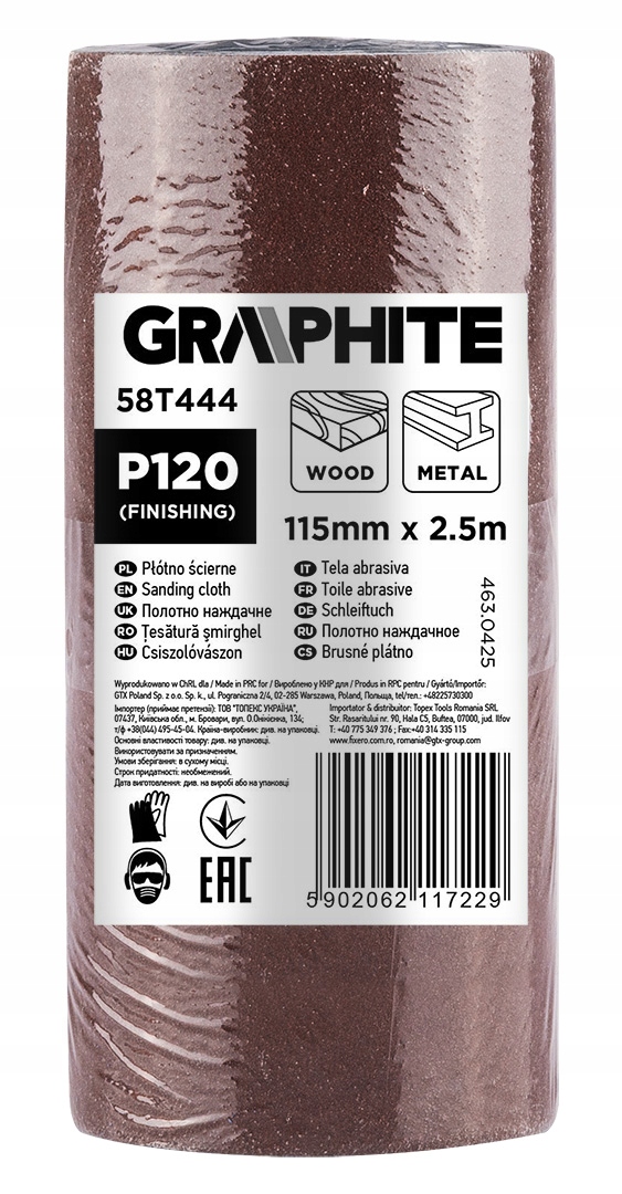 Абропп у ролиці 2,5 м х 115 мм, P120, 58T444 від Graphite - це аксесуар, призначений для шліфування металу, деревини, пластмас і гіпсокартону. Продукт був виготовлений на основі полотна j -типу, яке характеризується високою гнучкістю та довговічністю. Абразивний матеріал має повну набережну - 100% поверхні покрита абразивним зерном (електрокорунд), забезпечуючи ефективне шліфування. Графітове полотно призначене для ручного шліфування.