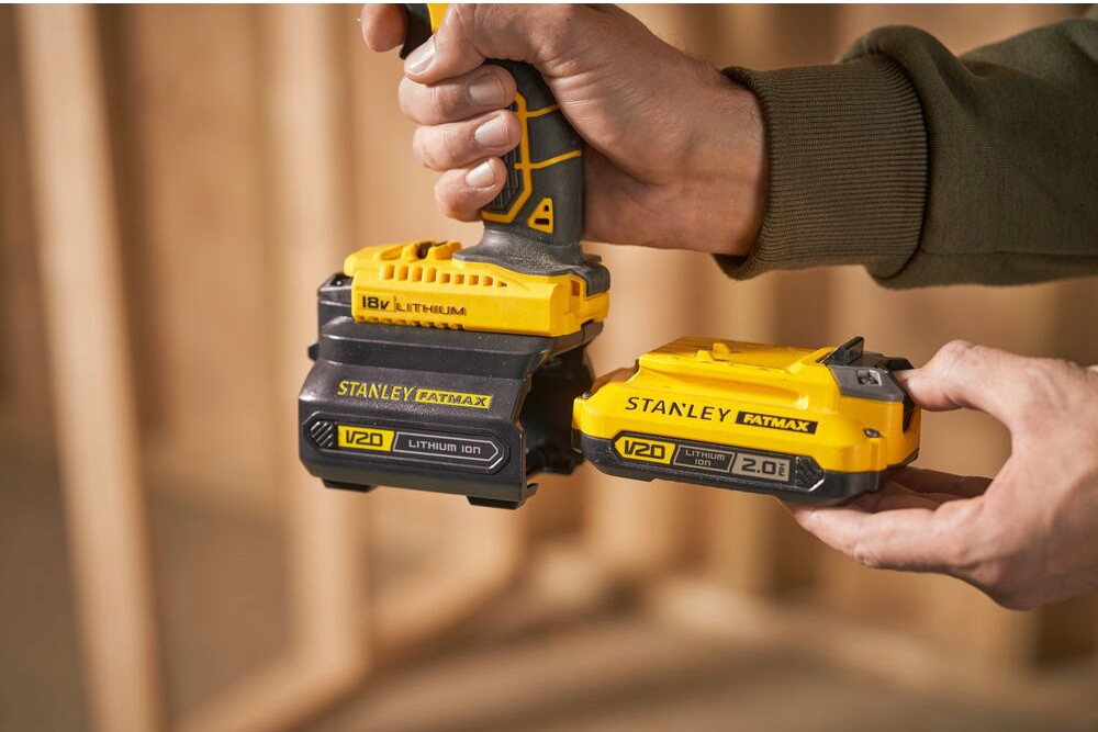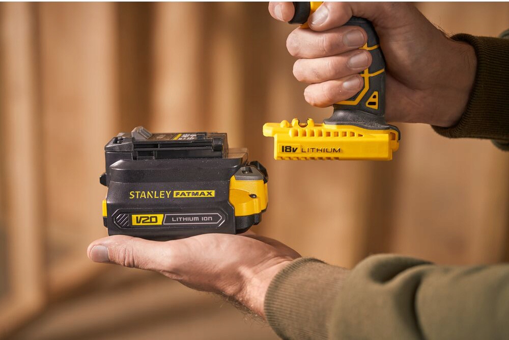- Адаптер перетворює 18 В Stanley® FATMAX® V20 1,5 AH та 2,0 AH батареї для використання зі старими електроінструментами 18V Stanley® FATMAX®.