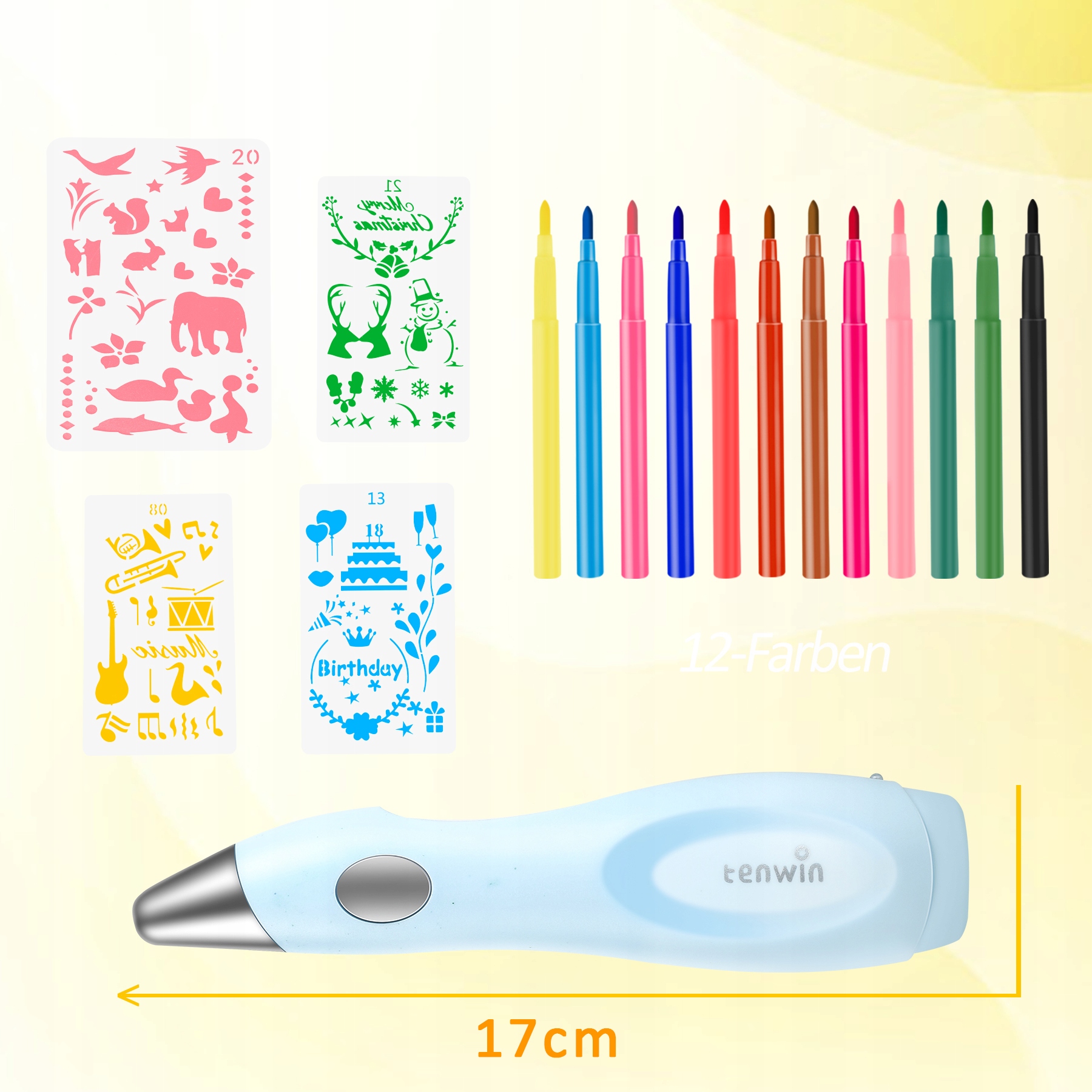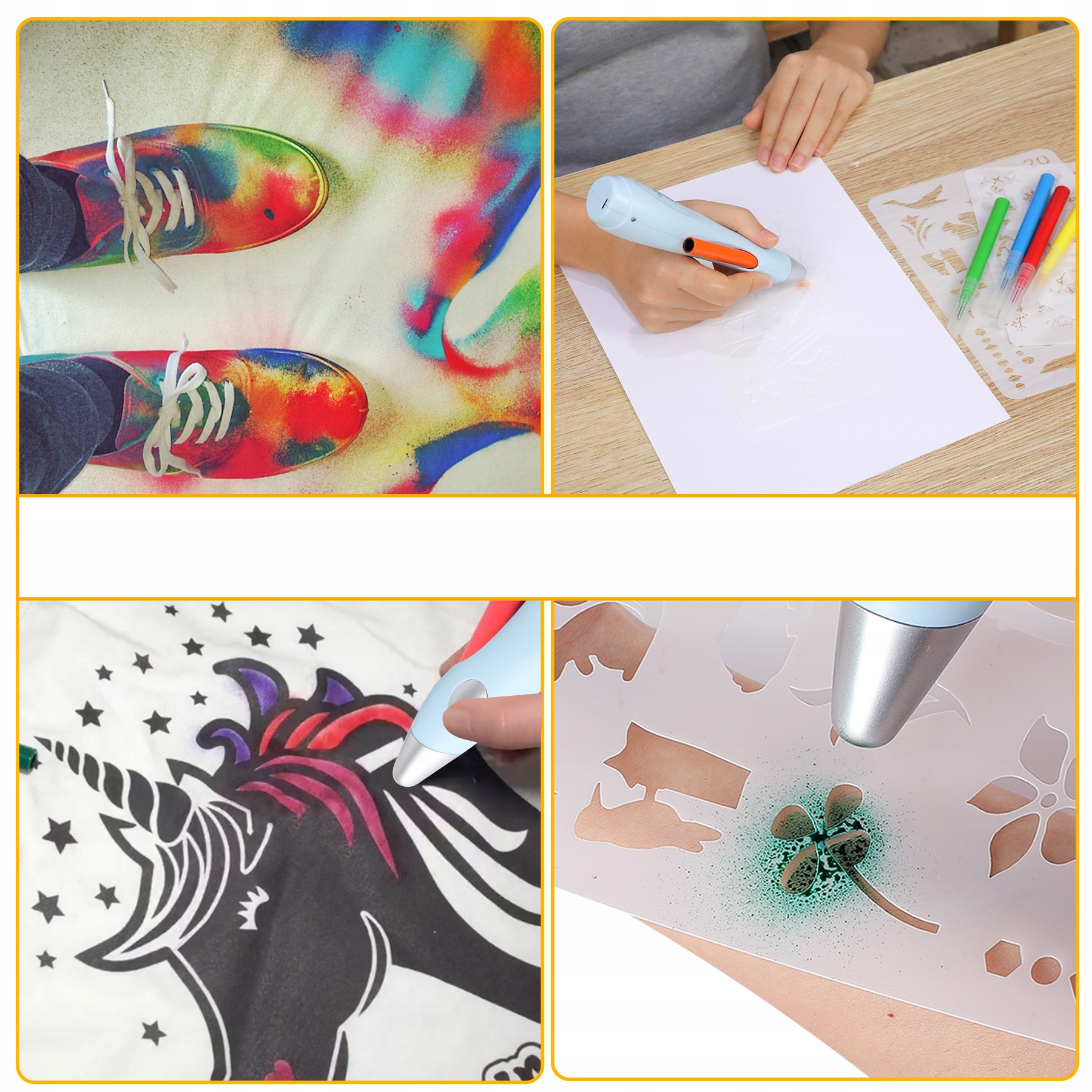 Електрична розпилення, аерограф, набір для дітей з 7 ручками та 56 шаблонів для фарбування та малювання, з USB -кабелем, синій