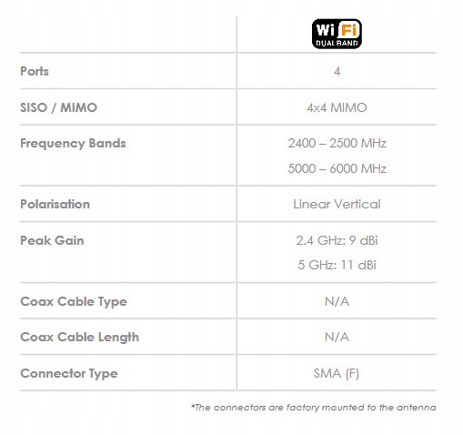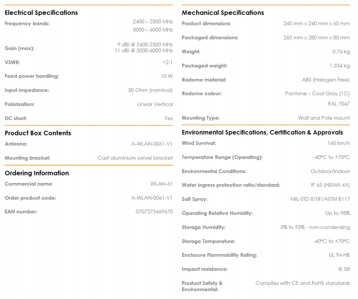 WLAN-61 — це дводіапазонна MIMO Wi-Fi антена, розроблена компанією Poynting, вона може підключатися до будь-якої точки доступу Wi-Fi, незалежно від чи то старіша технологія Wi-Fi, чи нова дводіапазонна технологія. Кілька дводіапазонних антен можуть вирішити проблему насичення каналів і забезпечити найвищу продуктивність і гнучкість Wi-Fi. Антена MIMO 4x4 має 4 різні орієнтації антен в одному корпусі. Це означає, що антену можна використовувати в конфігурації 2x2, 3x3 і, при необхідності, 4x4. Ширина променя забезпечує хороше покриття в офісах, залах, на фабриках тощо. Антена працює в двох діапазонах частот Wi-Fi: 2,4 ГГц і 5 ГГц, пропонуючи чудове використання радіоспектру. Антена має коефіцієнт підсилення 9 дБі в діапазоні 2,4 ГГц і 11 дБі в діапазоні 5 ГГц, що забезпечує найкращу продуктивність із надійним з’єднанням. Корпус виготовлено з ABS-пластику, який є ударостійким, а також стійким до кислот та інших хімічних речовин, які можуть бути присутніми на промислових підприємствах. Антену можна відкрити збоку за допомогою 4 роз'ємів SMA. Кабель можна прокласти через байпас, що усуває необхідність підключення до подовжувачів антени. Це позбавляє від втрат у з’єднаннях і необхідності герметизації та шпаклювання швів для зовнішньої установки. Ця антена призначена для установок, де 4x4 (чотири незалежних потоку) технологічно необхідні для просторово-часового мультиплексування. Він може використовуватися в приміщенні або на відкритому повітрі та ідеально підходить для використання на складах, виробничих підприємствах, будівельних майданчиках або в будь-якому іншому середовищі, де потрібне підключення Wi-Fi, з такими пристроями, як комп’ютери, мобільні телефони, планшети та інші пристрої IoT.