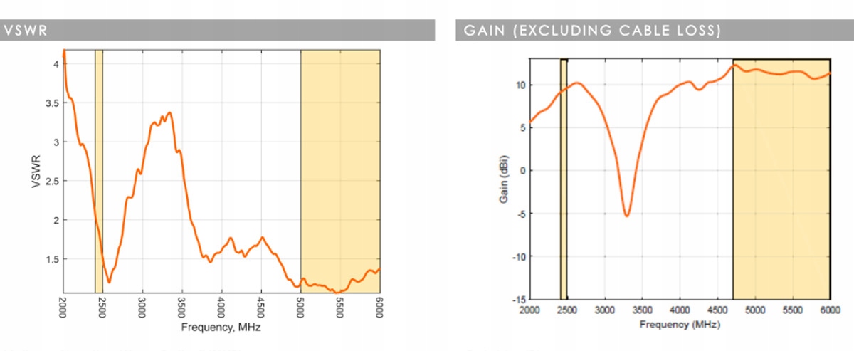 11 дБі — це пікове посилення в усіх діапазонах 2400-2500 МГц, 3300-3800 МГц і 5000-6000 МГц.