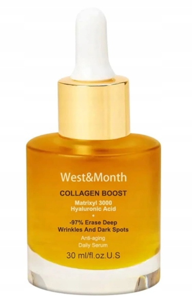 Західний та місячний колаген BOOST у сироватці 30 мл-Matrixyl® 3000 + гіалуронова кислота. зі ознаками старіння. Світла, швидко поглинаюча формула покращує помітний рівень гідратації, підтримує твердість, еластичність та гладкість і допомагає візуально зменшити видимість зморшок та знебарвлення. Скляна пляшка з піпеткою дозволяє виконувати гігієнічну та точну нанесення. Чому воно того варте? 4